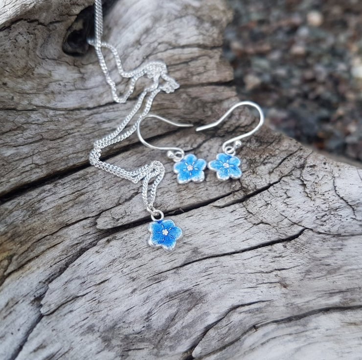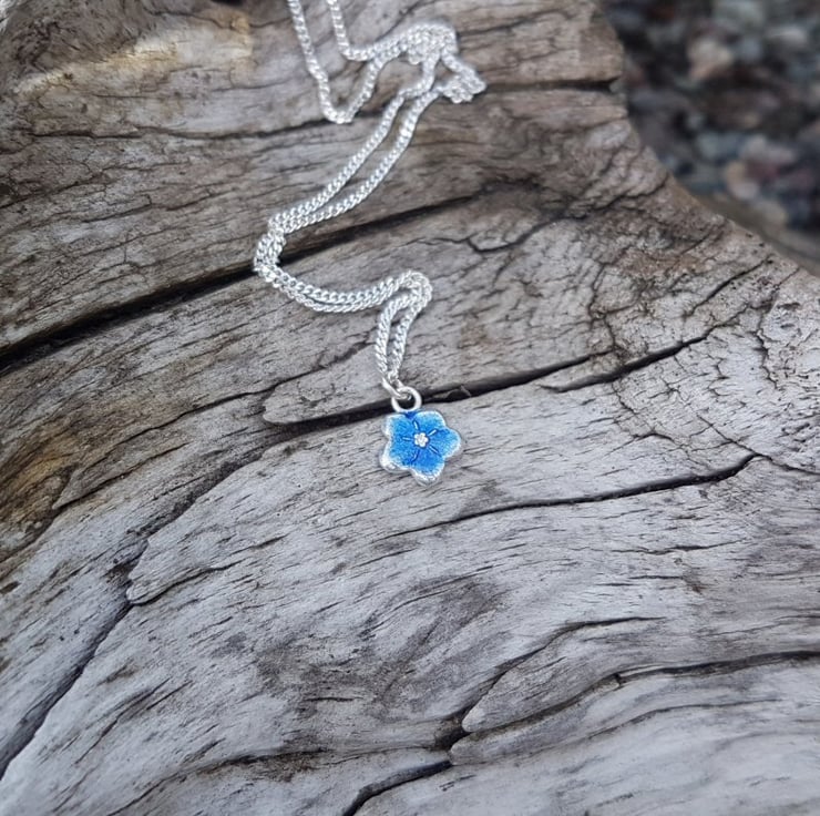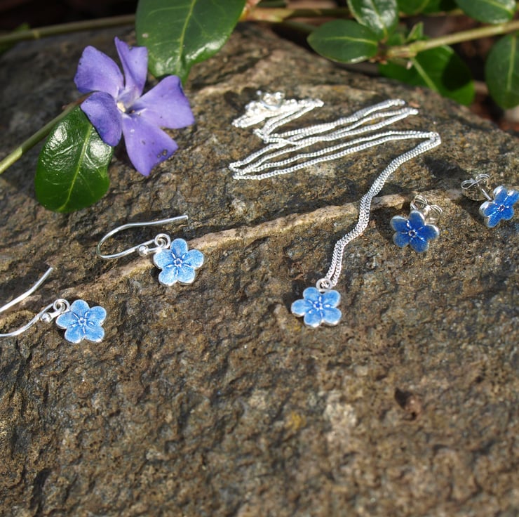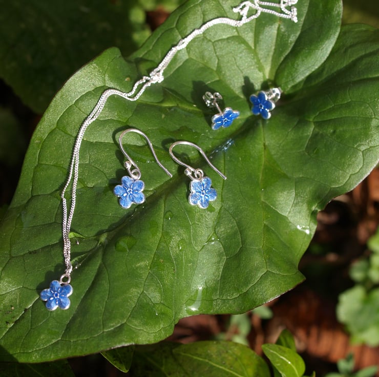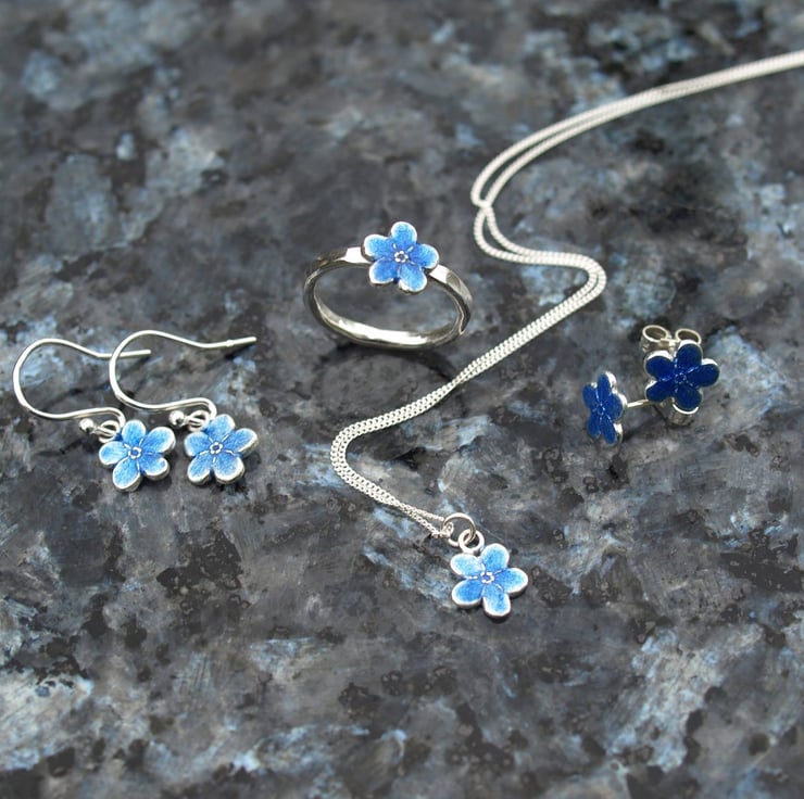 This sweet little flower is made from fine silver with a transparent light blue enamel on, the picture doesn't do them justice as the change colour when moving in the light.