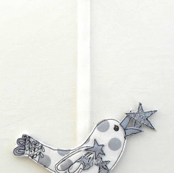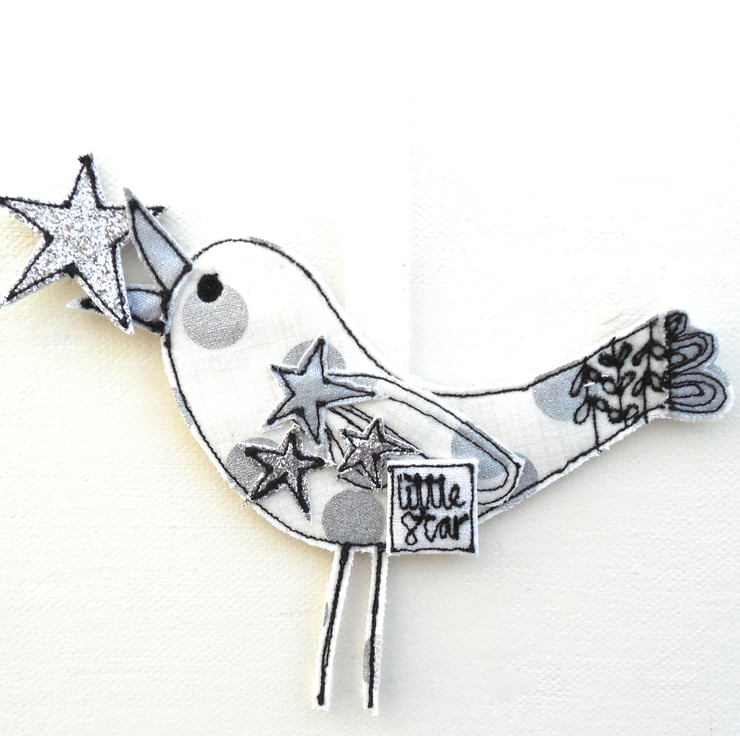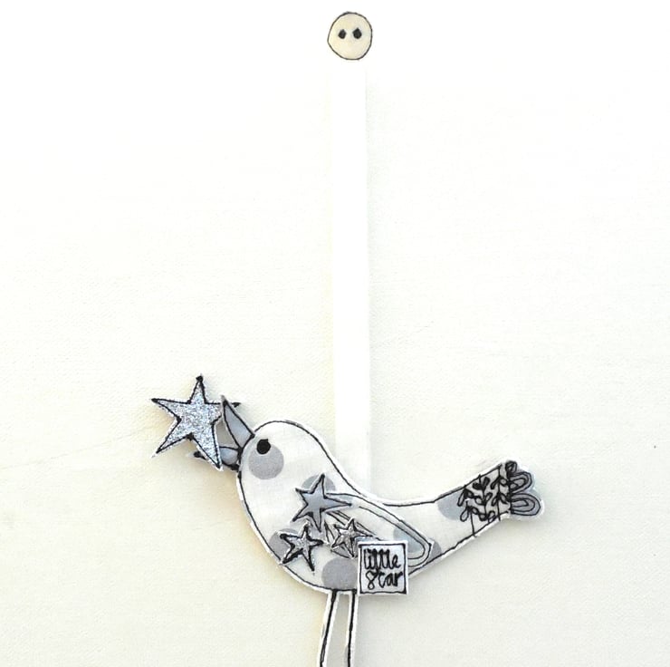 A white fabric birdie measuring approximately 14cm, with a sheer white ribbon to hang, in white cotton with metallic silver dots, a silver glitter star and a sewn fabric label 'little star'. Your 'little star' birdie will be sent in a glassine envelope with a heart label to close.
