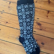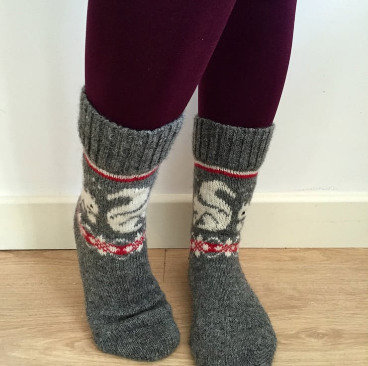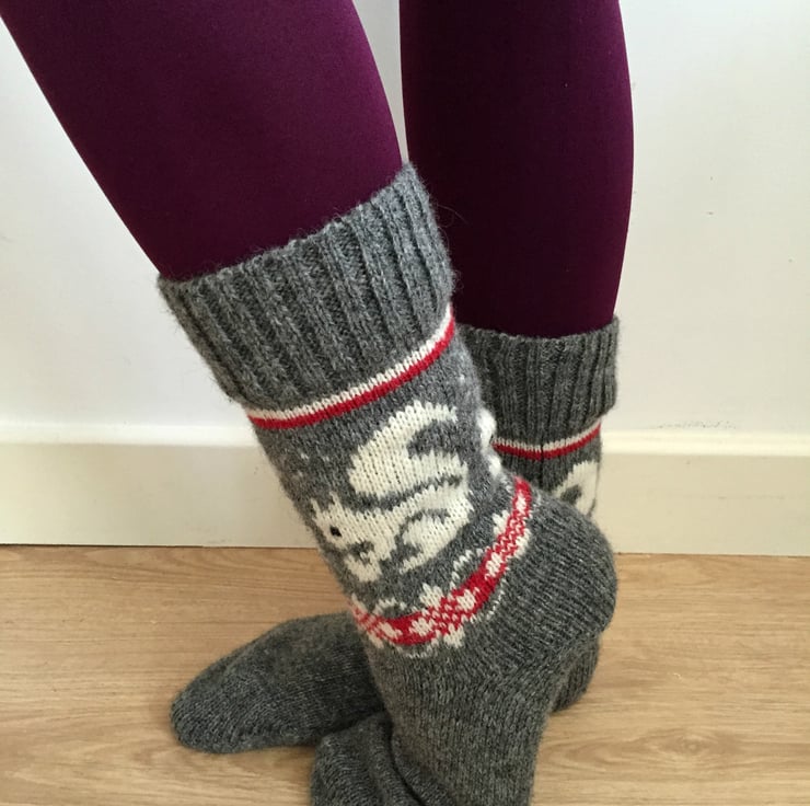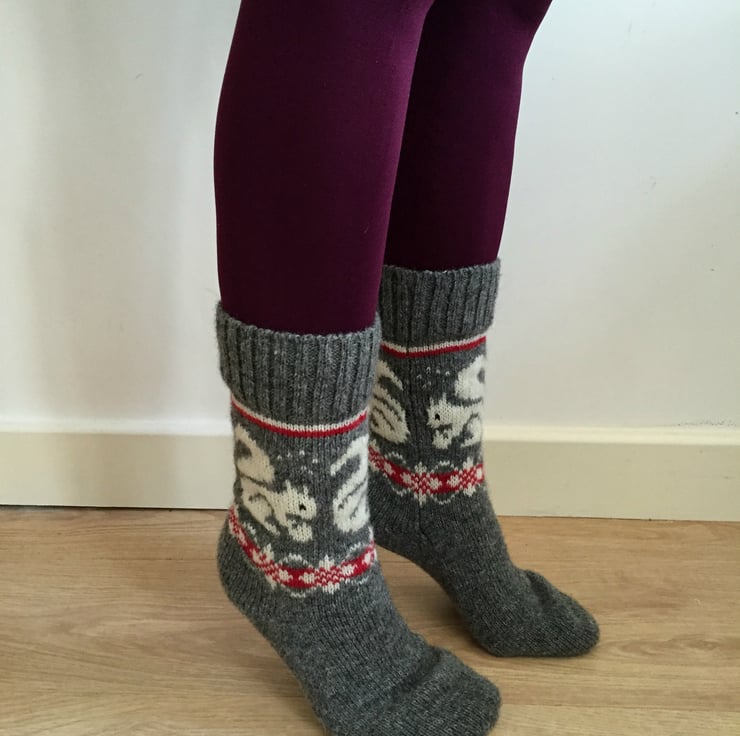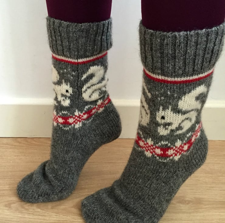 Dark grey socks featuring white squirrels and a traditional scandinavian red and white pattern.