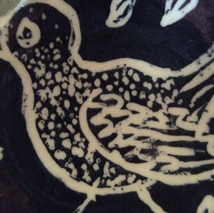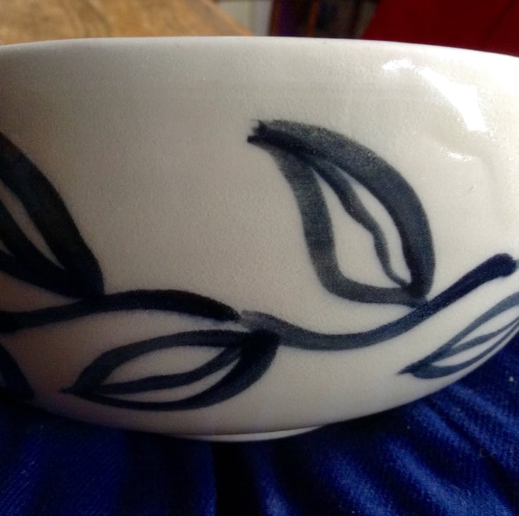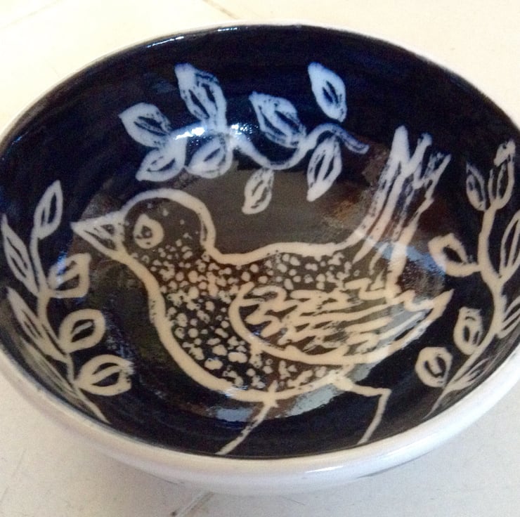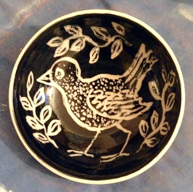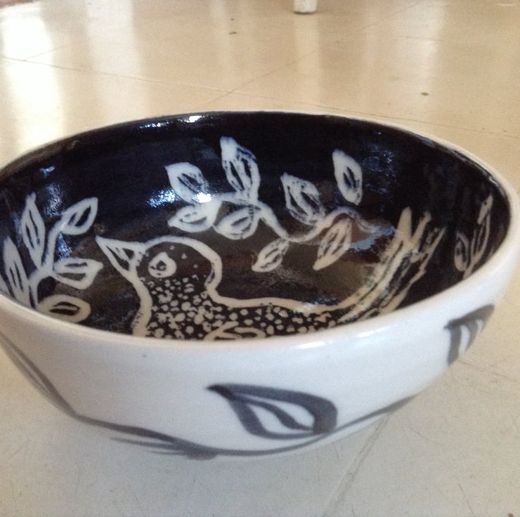 Black and cream bowl with bird design, using wax resist method. This is where liquid wax is applied to the raw clay bowl, which is then painted over with colour. When the bowl is fired the wax burns away leaving the design showing. This method gives a nice soft effect to a design. The bowl is fired to stoneware so is tough and durable, microwave and dishwasher safe. The bowl measures 16.5 cms across and is 7 cms deep.