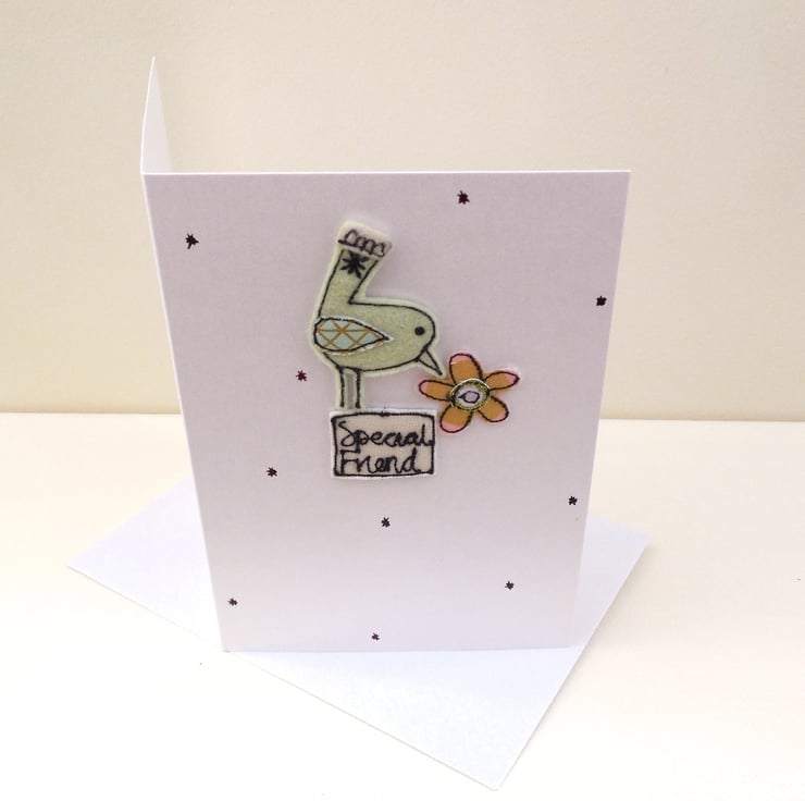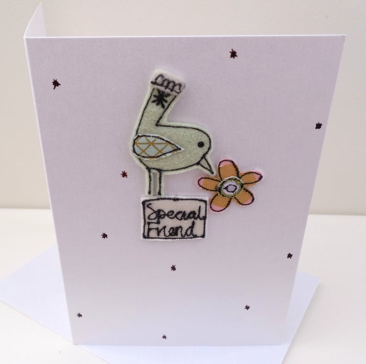 An embroidered birdie sits holding a fabric flower on a sewn fabric label of 'Special Friend'. With hand drawn by me, in ink stars.