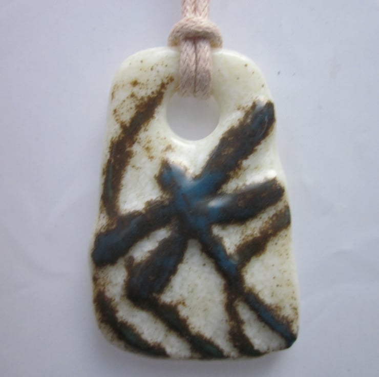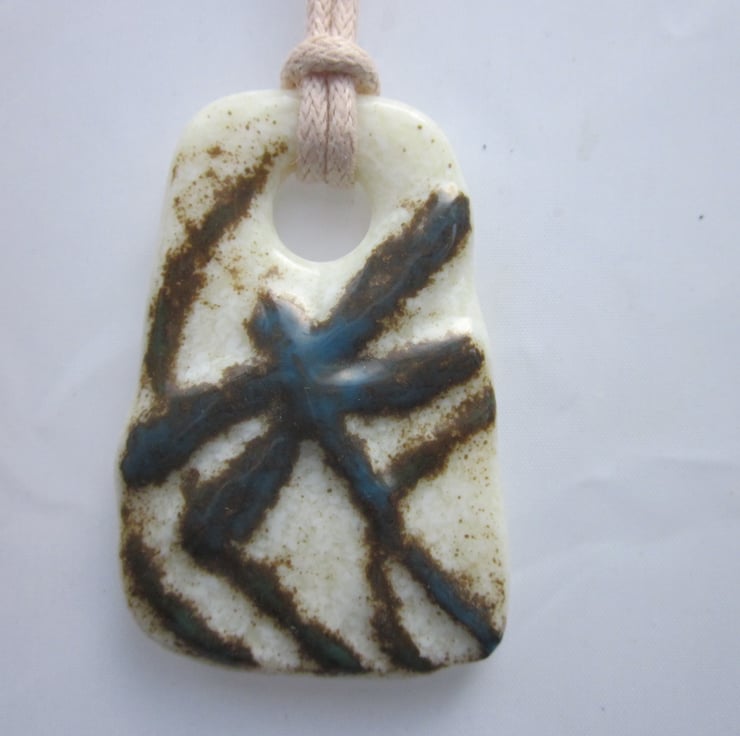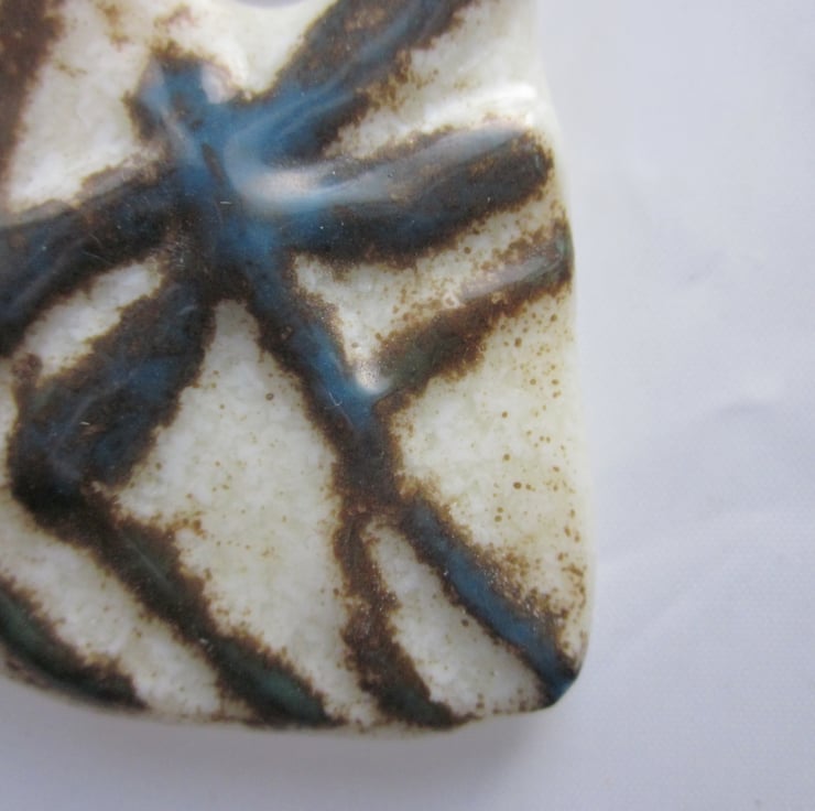 It is a stunning ornament, with multiple layers of Egyption blue and vanilla frit creating a beautiful marbled effect. The copper in the blue glass has reacted with the sulphur in the vanilla to create a pleasing chocolate colour. The surface is textured to provide a contour of a dragonfly making this a very tactile piece. This is a unique and eye catching piece of costume jewellery.