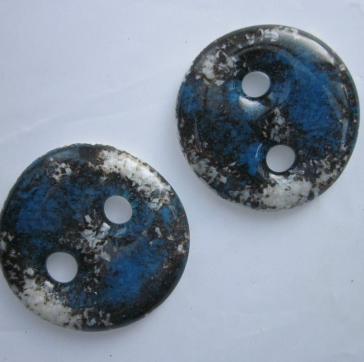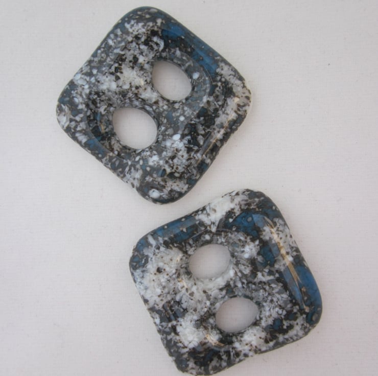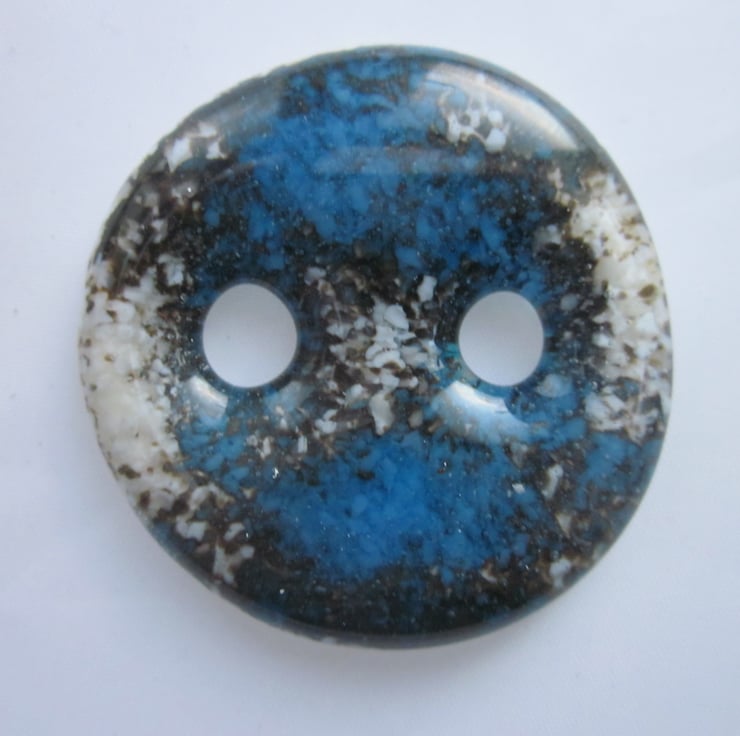 These button are made with Egyptian blue frit cast within an vanilla base and encased in clear glass. The copper within the blue has reacted with the sulphur in the vanilla glass making a truly unique reaction, like marble veining. Some of the blue has darkened to a dark chocolate.They are approximately 4cm across. They will be perfect to fasten a bag or hand knit cardigan.