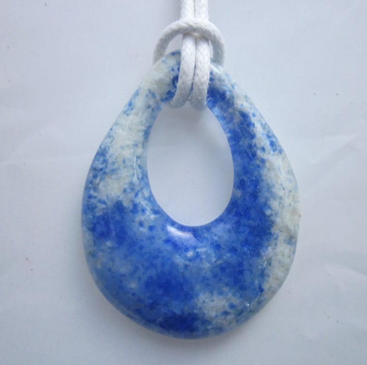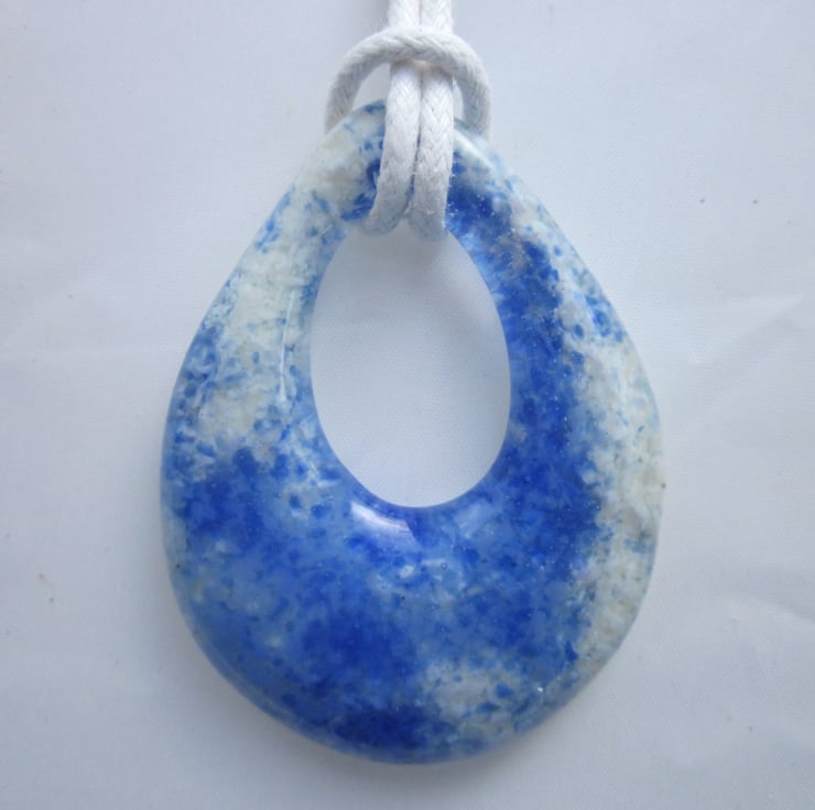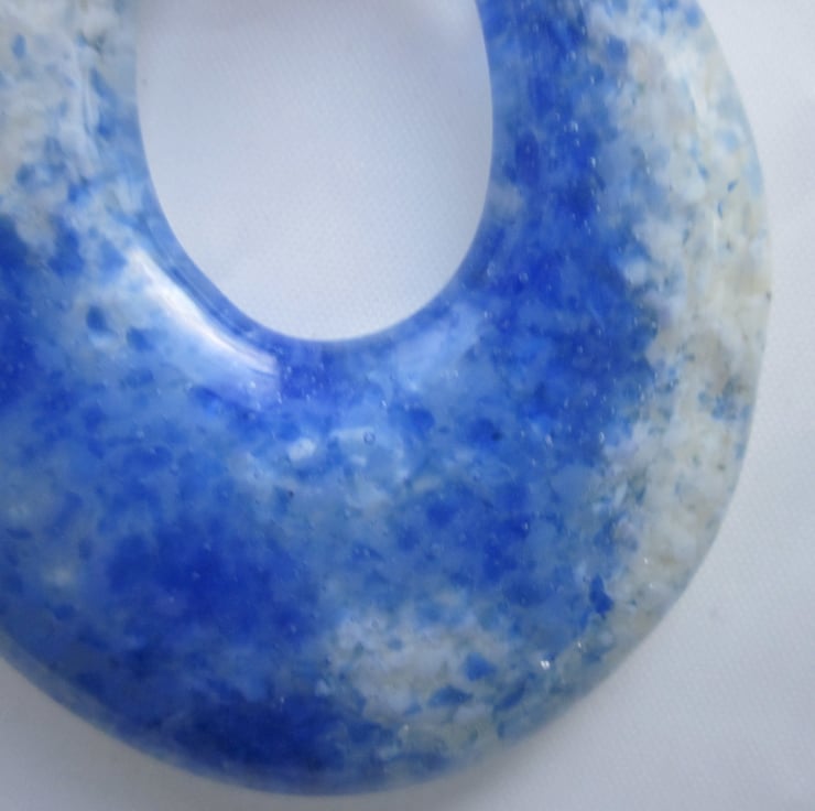 It is a striking pendant, with royal blue frit in an ivory base. It looks like an uncut sapphire.