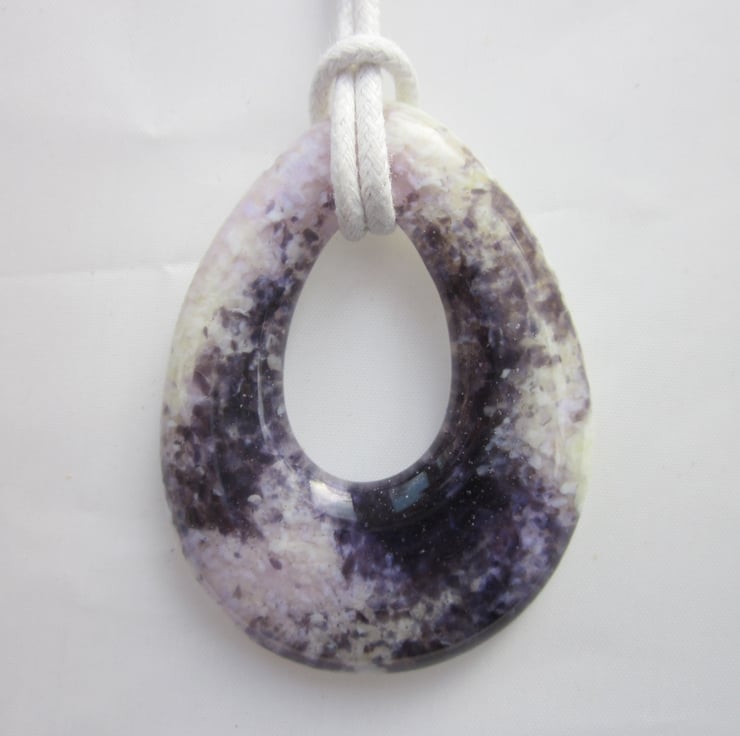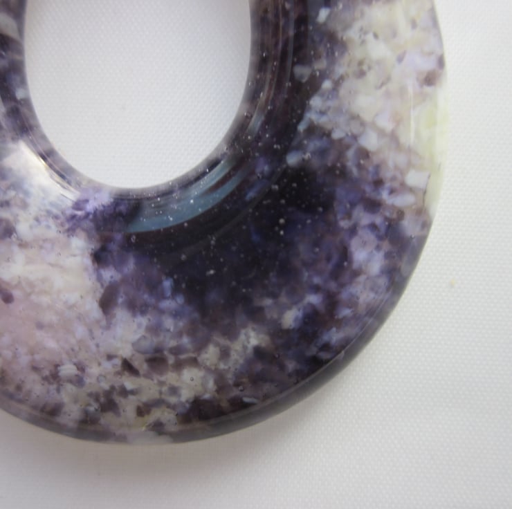 It is a striking pendant, with royal blue frit in an ivory base. It looks like an uncut amethyst.