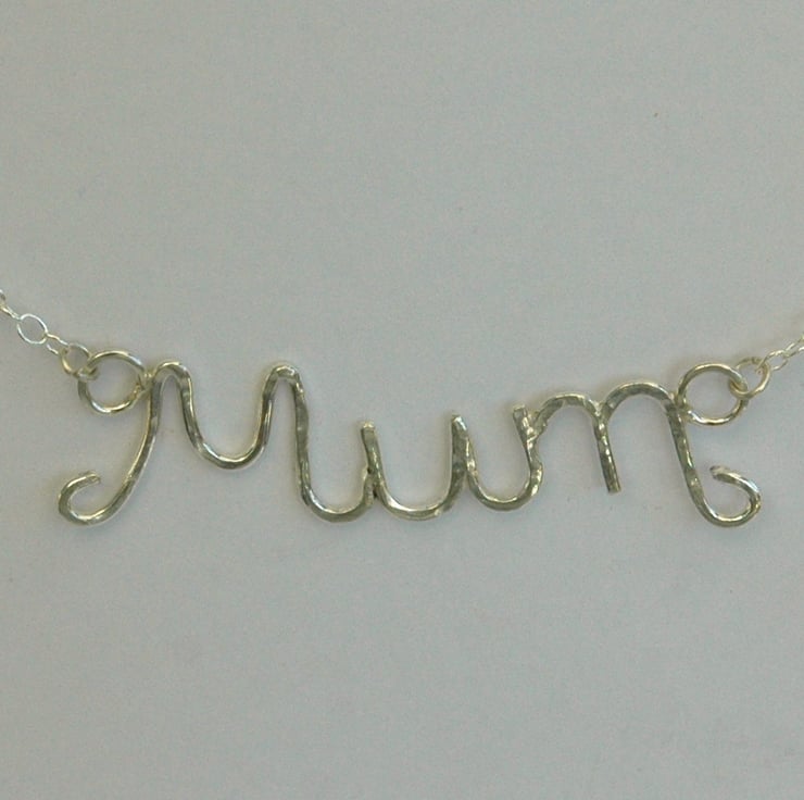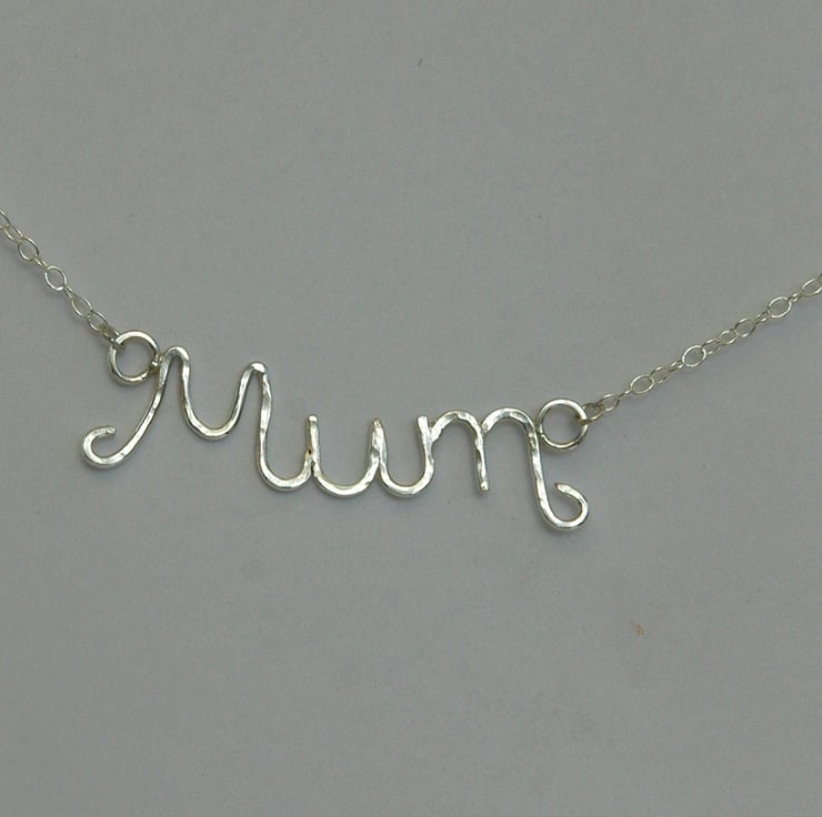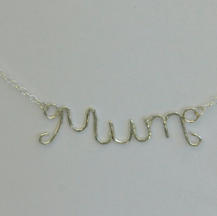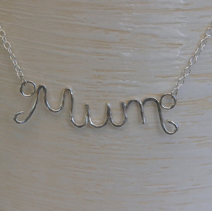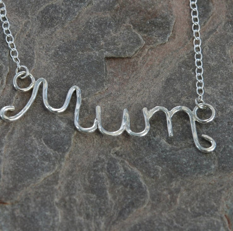 A perfect gift for Mother's Day or for your Mum's birthday! The word 'Mum' has been delicately wrought using 1mm thick sterling silver wire. I cut seven separate lengths of wire and soldered them together using four different grades of solder. I then hammered the surface lightly and tumble-polished it to harden the silver and give it a bright shine. The pendant measures approximately 4.3 x 1.5cm and is attached by jump rings to an 18inch (45cm) sterling silver trace chain.