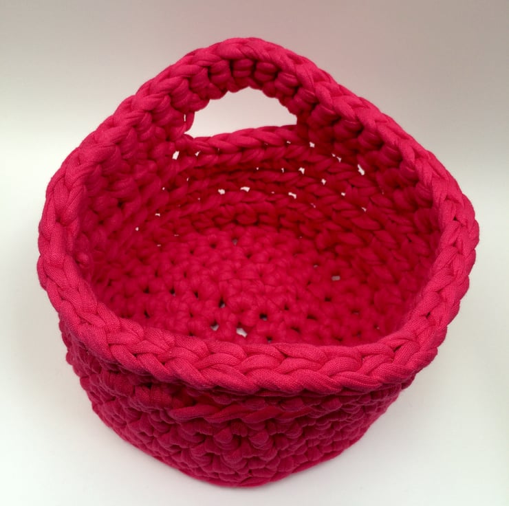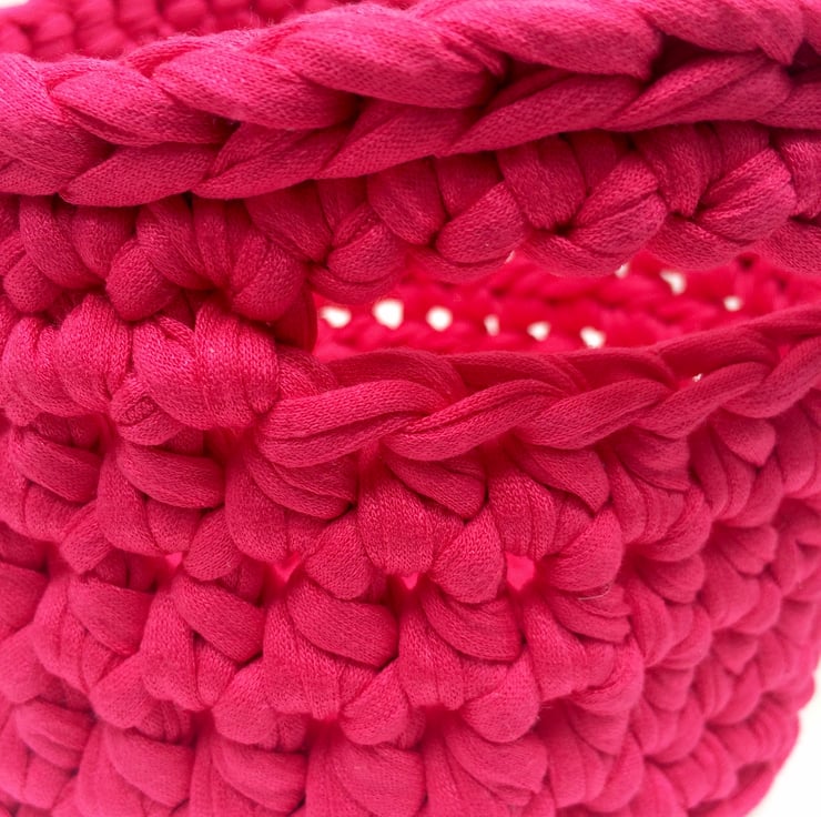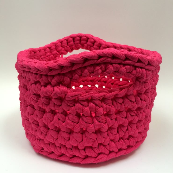 Made with soft upcycled textile yarn in a bright shade of pink, the basket is approx 15cm diameter and 10cm tall. It has two handles which are the perfect size for little hands.