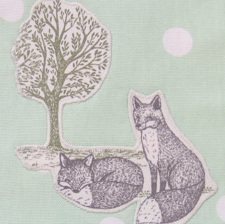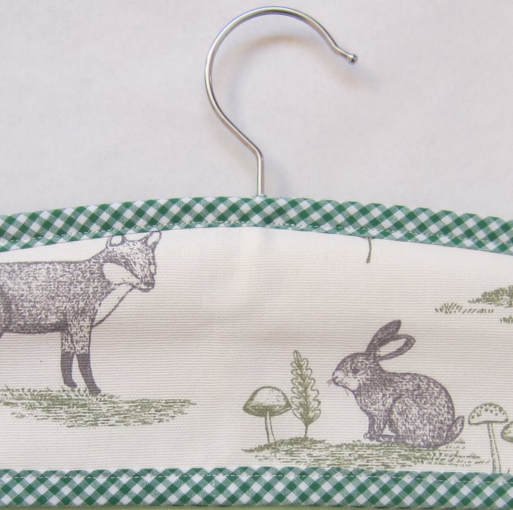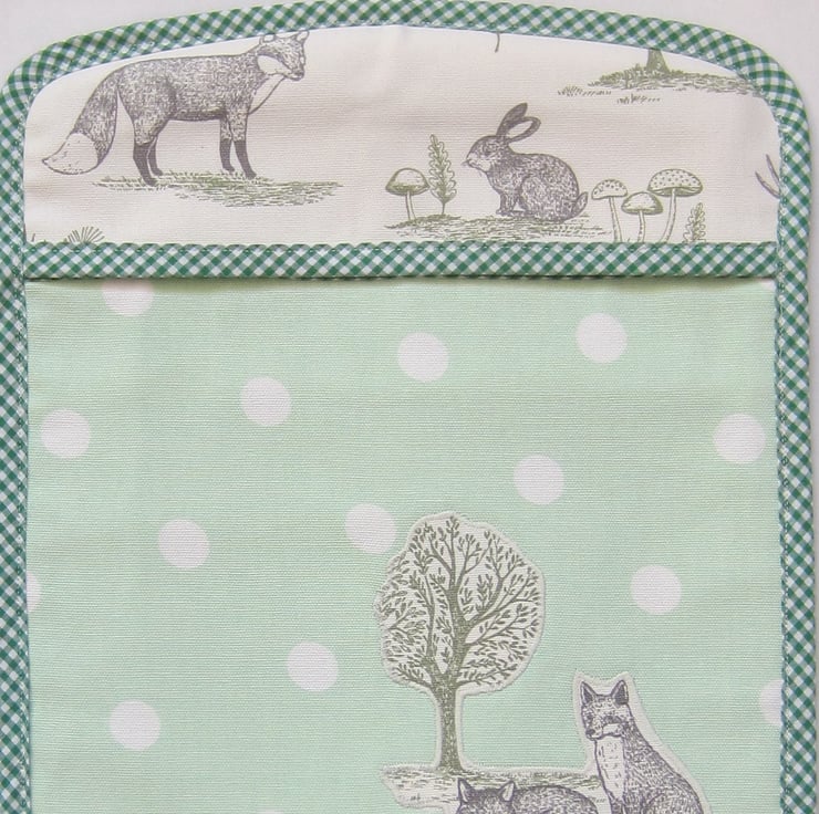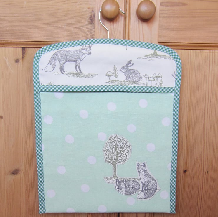 Sturdy pale green and white spot peg bag with foxes applique and fox and rabbit top. Edged with green gingham and lined with a pastel striped pattern in green, blue and lemon. Plenty of room for lots of pegs or use for other storage. It measures 36 x 30 cm and hangs with a strong wooden coat hanger.