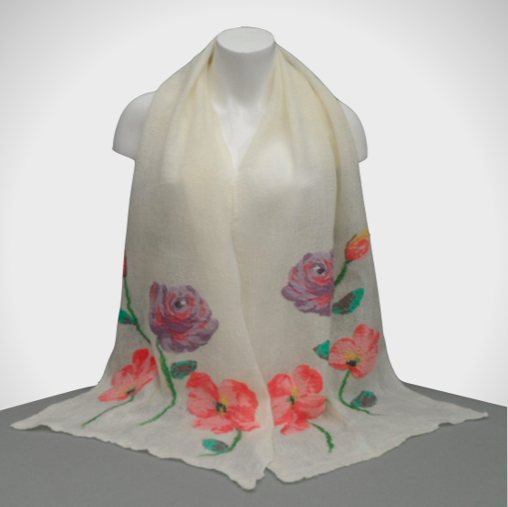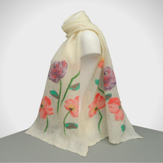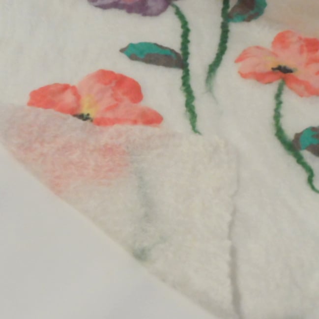 Beautifully soft and lightweight this scarf has been made using a nuno felting technique. Extremely fine layers of soft merino wool in natural white (unbleached) have been laid over both sides of a cream coloured silk chiffon scarf. Large pink and purple flowers have been cut from a sheer fabric and added to the surface on one side prior to felting.