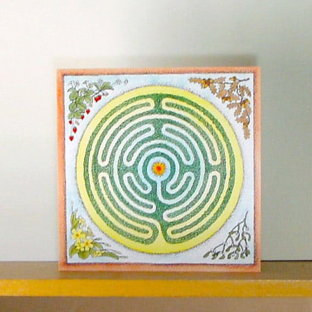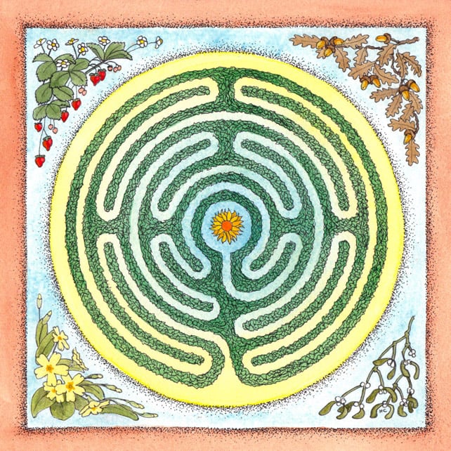‘Labyrinth’ - This card is a reproduction of one of my original watercolour designs. Inspired by the experience of walking a labyrinth in a beautiful garden, I combined this universal symbol of journeying and self-discovery with plants representing the four seasons - spring, summer, autumn and winter.