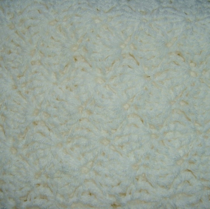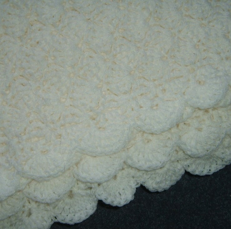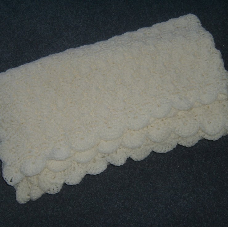a beautiful hand crocheted shell pattern baby shawl in white acrylic.