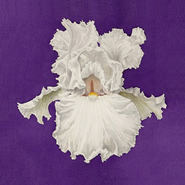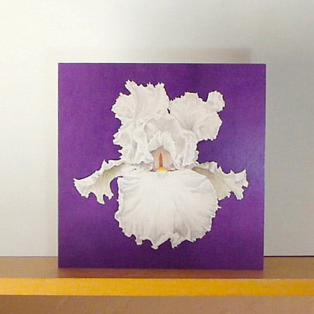 ‘White Iris’ - This card is a reproduction of one of my original watercolour designs. Inspired by the magnificent beauty of a pure white iris blooming in my garden, I set it against a deep velvety purple background.
