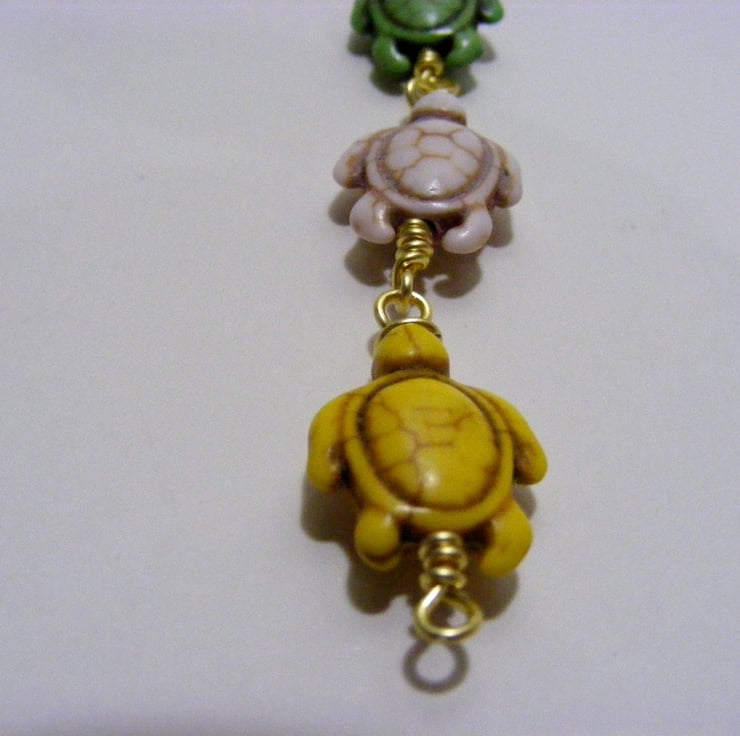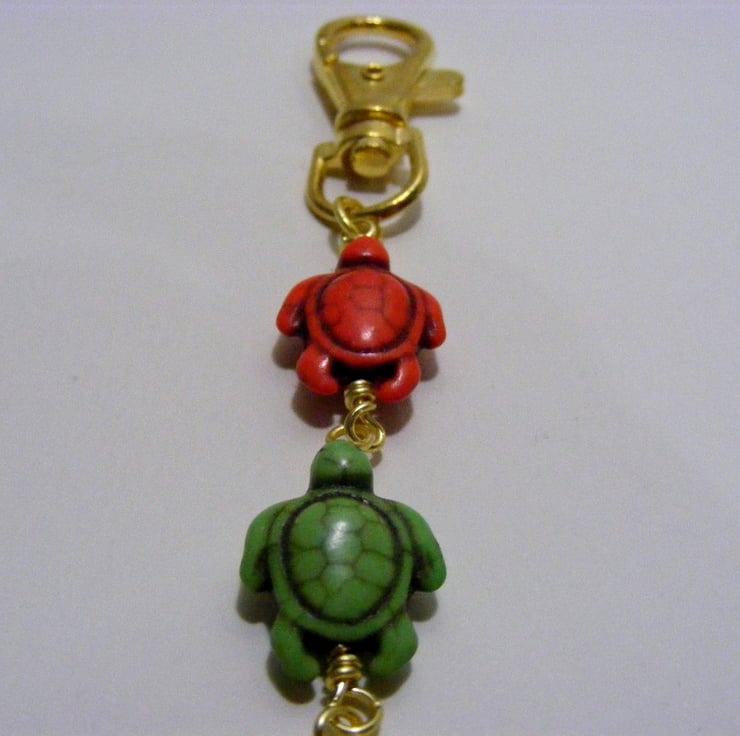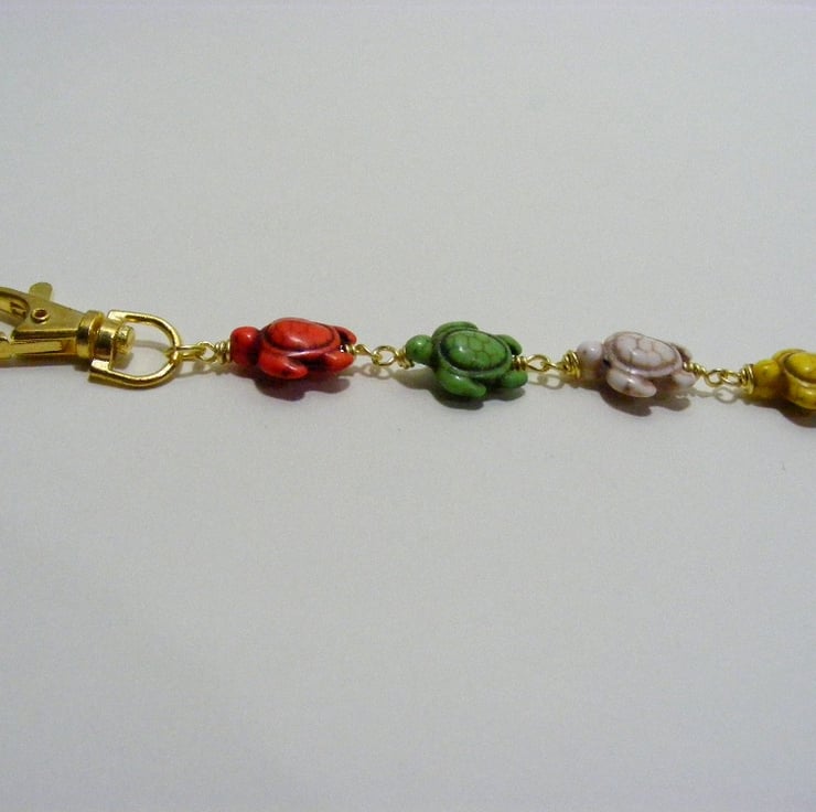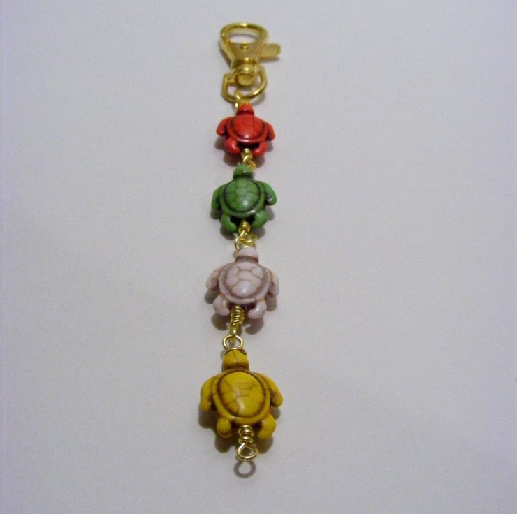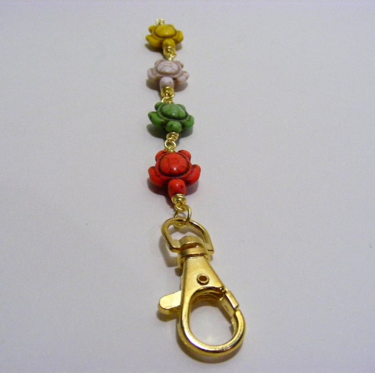 I have made this novelty bag/key charm by wire wrapping together 16 x 15 mm magnesite turtle beads in yellow, cream, green and red. Wire and clip are gold plated.