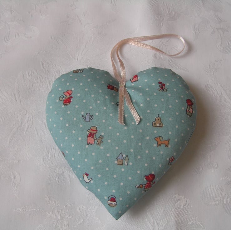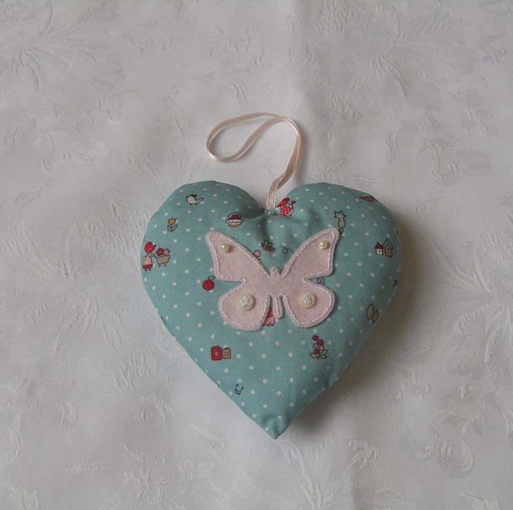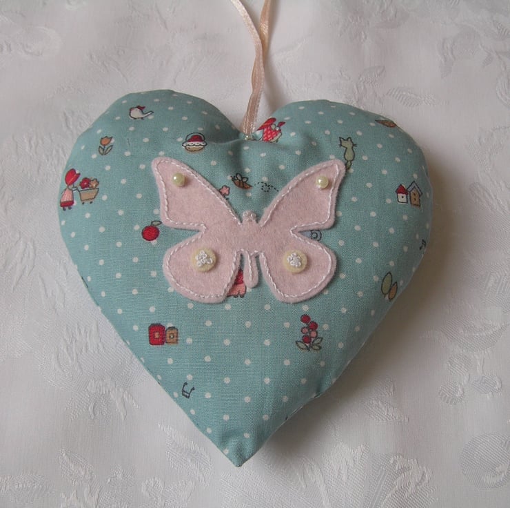 Hanging fabric heart, made using a blue and white spot patterned cotton fabric, with a pale pink hand embroidered butterfly to the front.