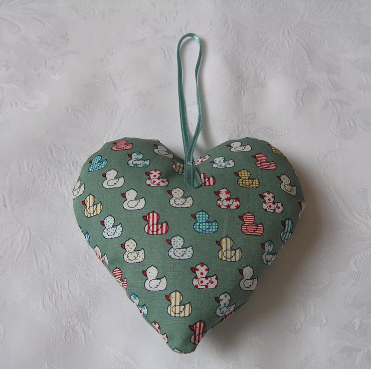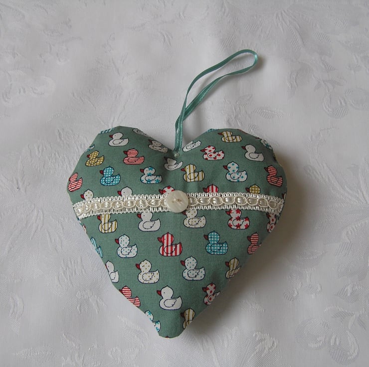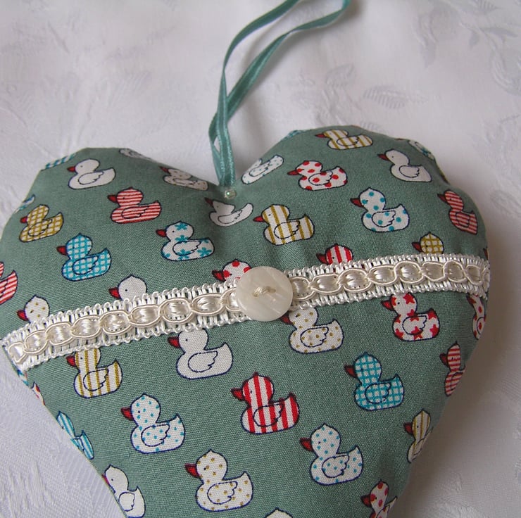 Hanging fabric heart, made using a green duck design fabric. Has a cream ribbon and button across the front, hanging on a green ribbon attached with a small bead front and back.