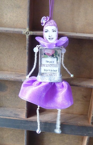 I made the body by cutting glass pieces and soldering them together. I glittered a wooden bead for the head, added a beautiful vintage face and a floral head decoration. The skirt is made from ribbons and the arms and legs are made from head pins so the limbs freely move about, I've used a mix of seed beads and Swarovski crystal element beads. All together it makes up this very cute and individual birthday keepsake. Inside the glass body is a backdrop of flowers and a typed sentiment saying Happy Birthday. This would make an ideal alternative to a birthday card.