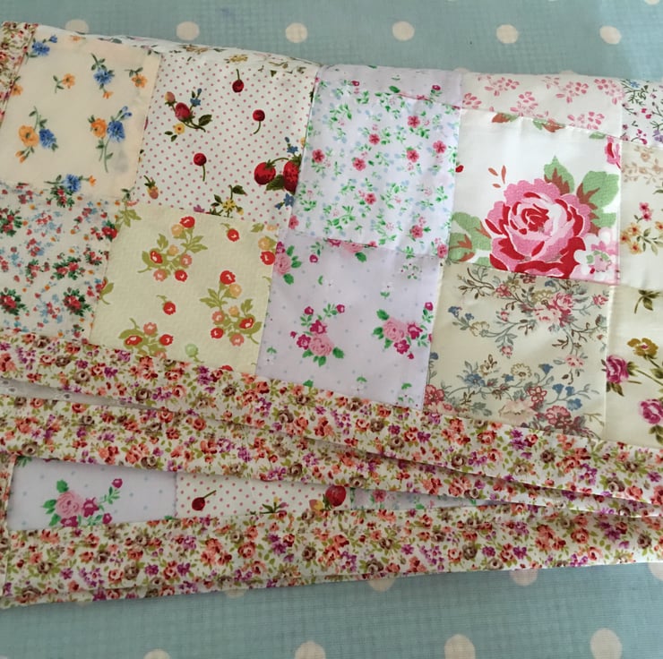 Sweet little patchwork quilt roughly 30" x 20" , it has been made with a pretty selection of cotton fabrics with a pretty trim and backed with a white broderie anglaise cotton fabric with soft wadding