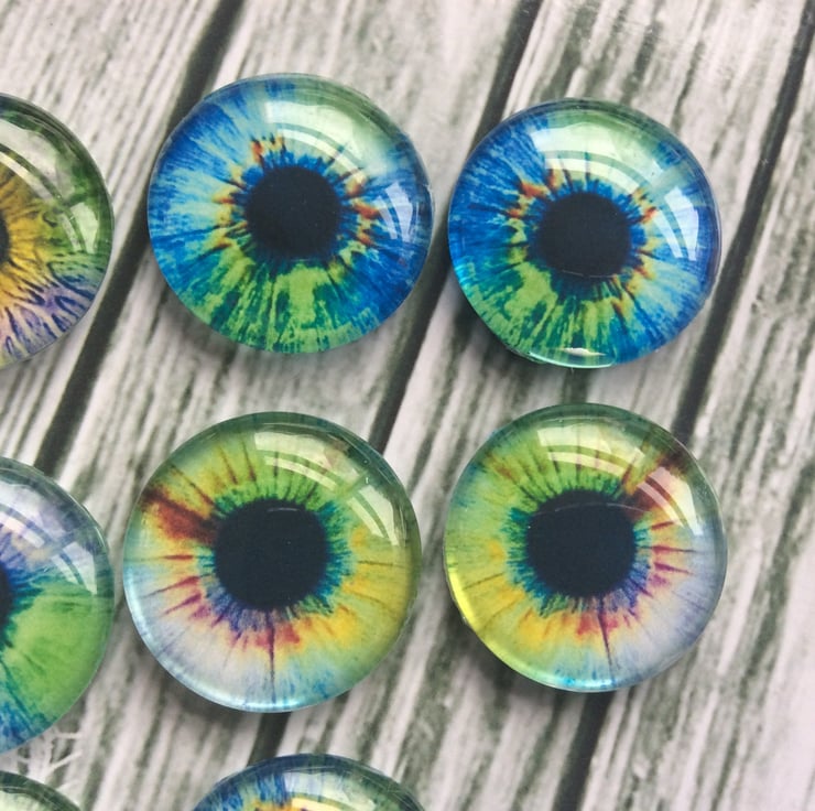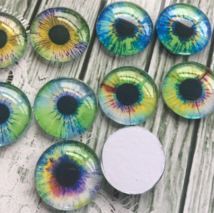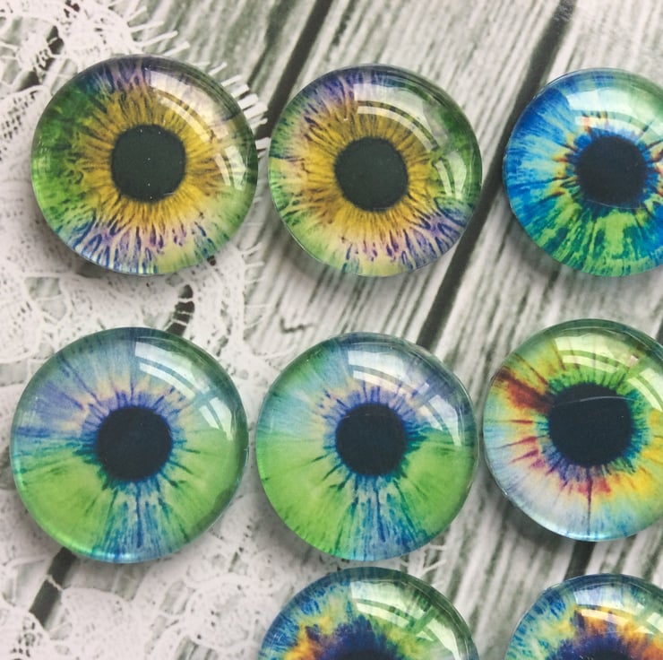 You will receive 10 cabochons that will have designs the same or similar to those shown in the photos, 5 pairs of eyes to a pack.