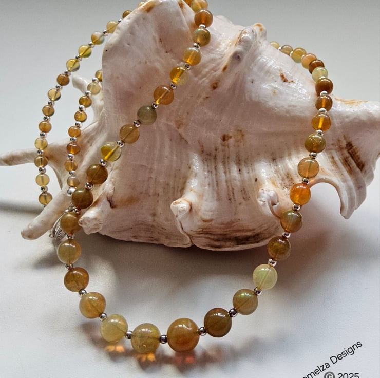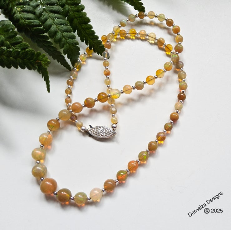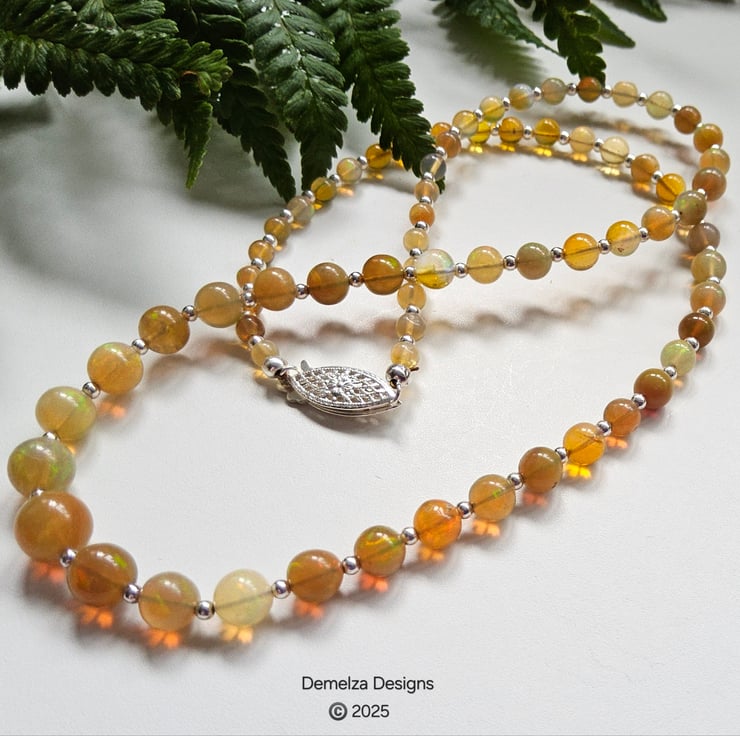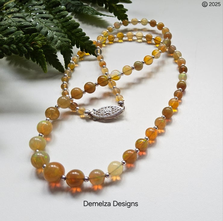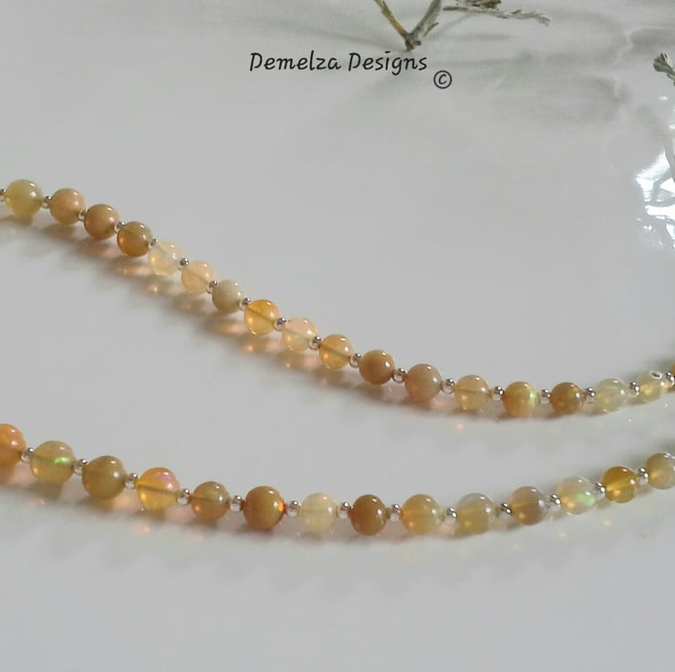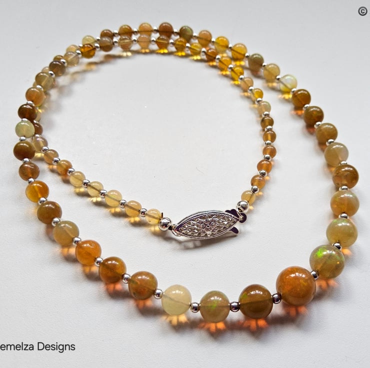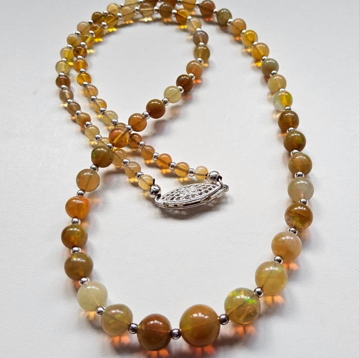 The necklace has been constructed using professional coated stainless steel jewellers wire for added strength and lasting durability. Between each stunning graduated wello opal from Ethiopia are 2mm sterling silver spacer beads to compliment the opals. I have incorporated a traditional design sterling silver filigree clasp commonly used within the industry for quality opals and natural sea pearl necklaces. The finished length is approximately 18", unfortunately this item can not be extended in length using more opals.