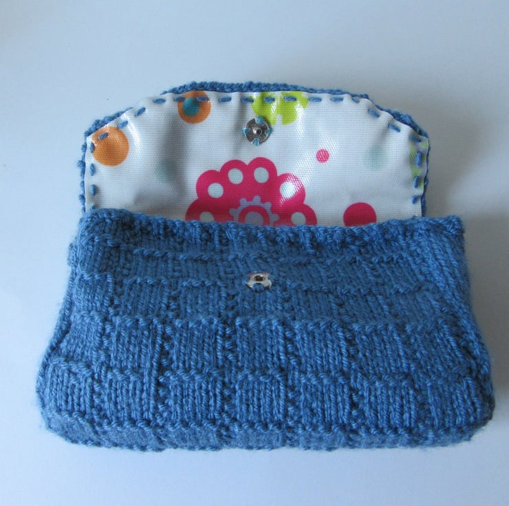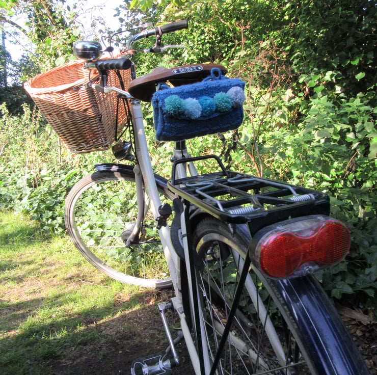 A beautifully girly bright classic blue hand knitted saddle tool bag with pompoms.The bag is knitted in a basket weave stitch in a bright blue coloured yarn and has five handmade pompoms sewn to the front: meadow green, duck egg blue, turquoise, green and silver. Attached to the reverse are 2 x 35cm long matching blue cord ties, which ensure the saddle tool bag can be attached to the underside of most saddle sizes and makes.The ties are discreetly reinforced with buttons on the inside.The inside is lined in a bright coloured 'button, spot and flower' pop art motif PVC fabric, giving a water repellent layer.The saddle bag is closed using a strong popper, also reinforced with a button on the inside.