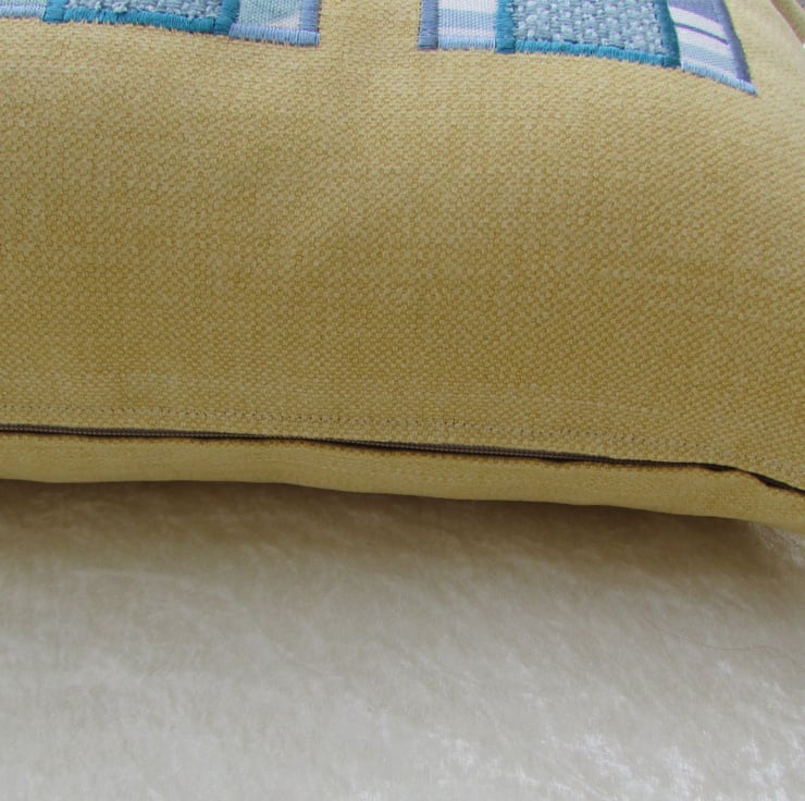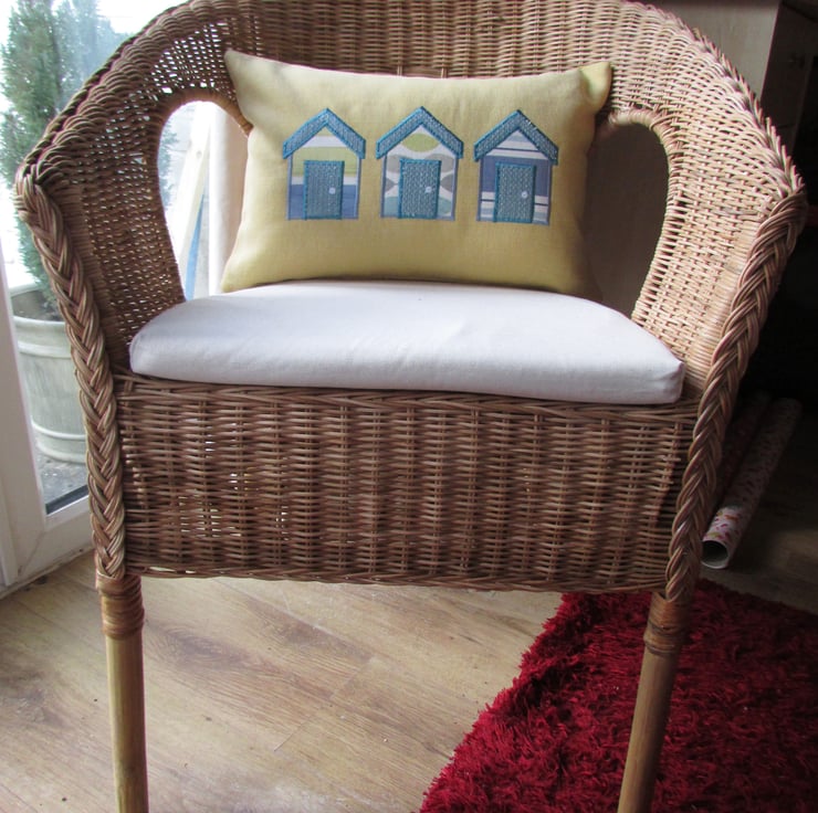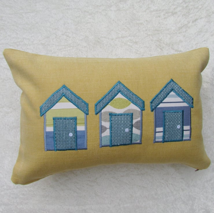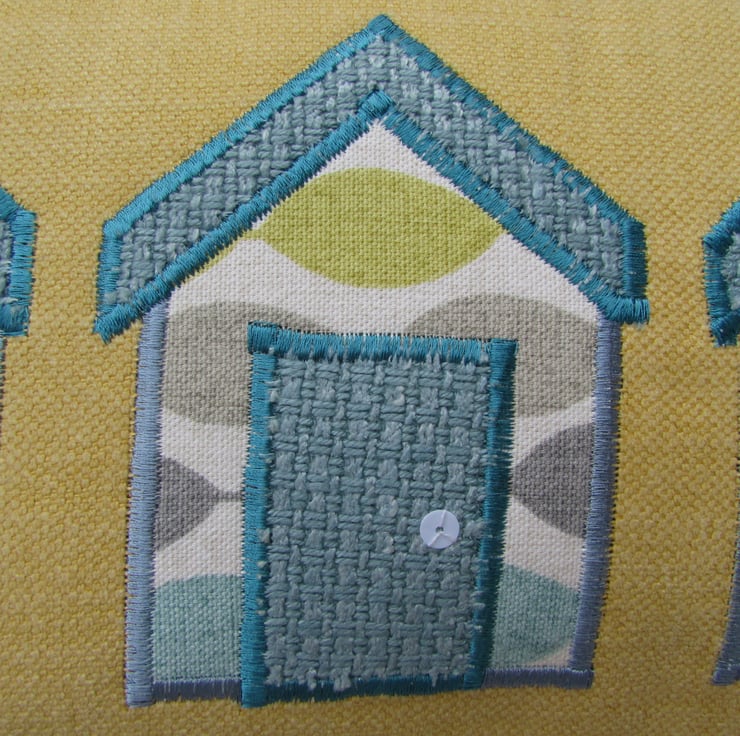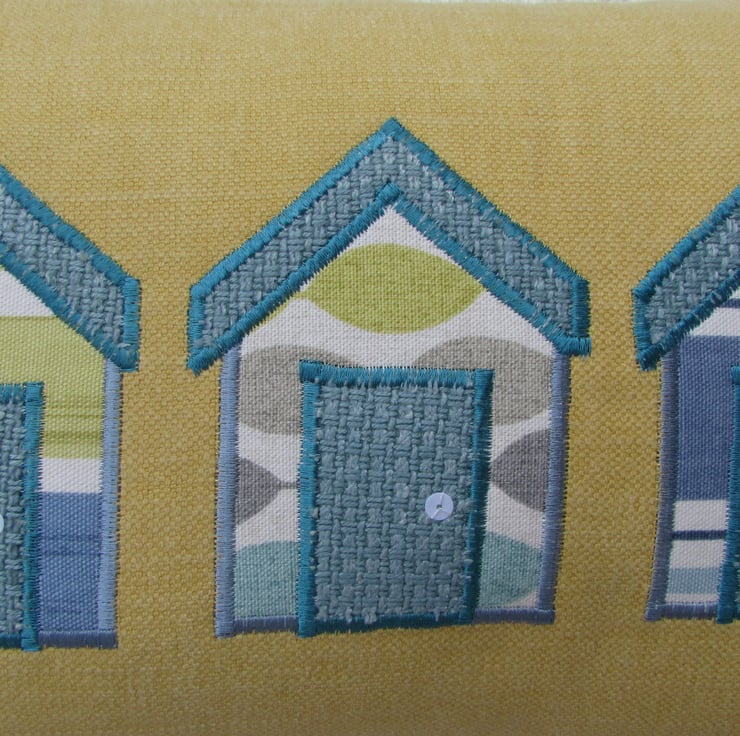A rectangular cushion in summery golden yellow fabric with three appliqued beach huts. The beach huts consist of some lovely coordinating striped and patterned fabrics in blue, turquoise, white and yellow-green. The roofs and doors are made from a roughly woven textured turquoise fabric and the doors are embellished with white sequin door handles.