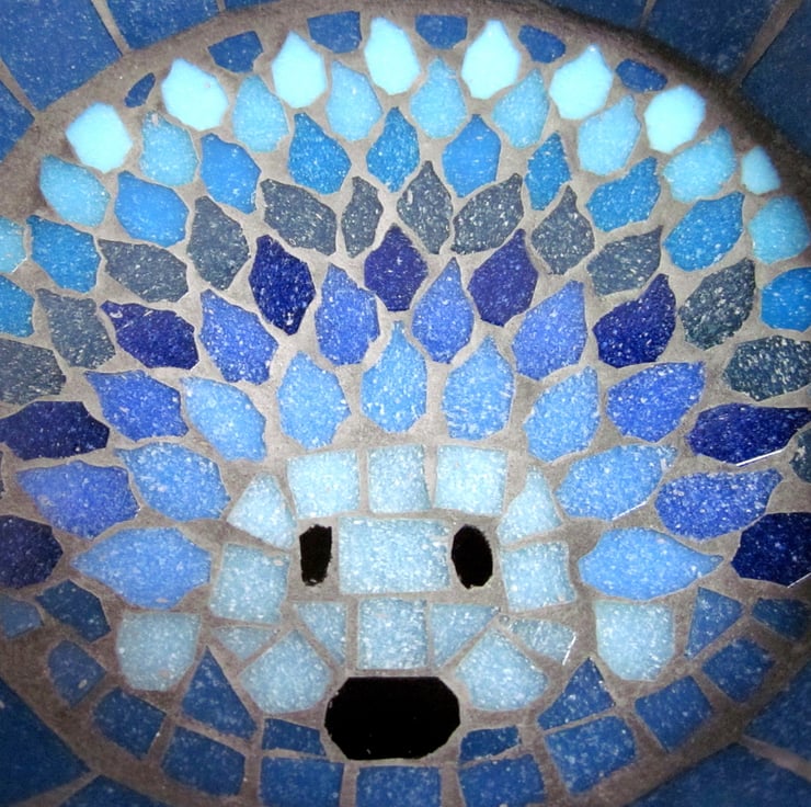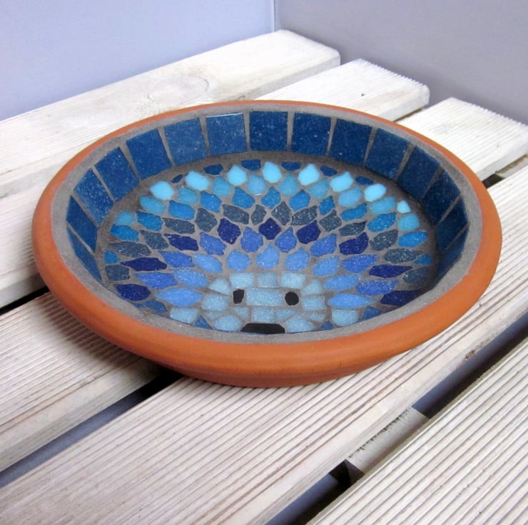 A mosaic hedgehog made using shades of blues from aqua to turquoise, and sky to sapphire. The saucer is perfect for leaving fresh water out for the hedgehogs in your night garden. Great to add colour to the garden, and for birds to drink from in the day too, and it would make a perfect gift for a gardener or wildlife lover.