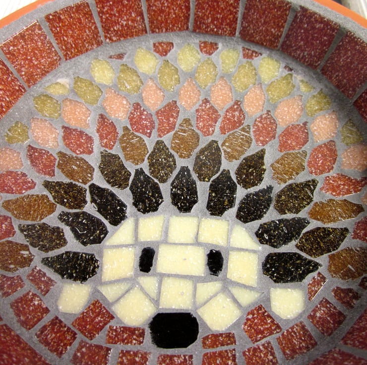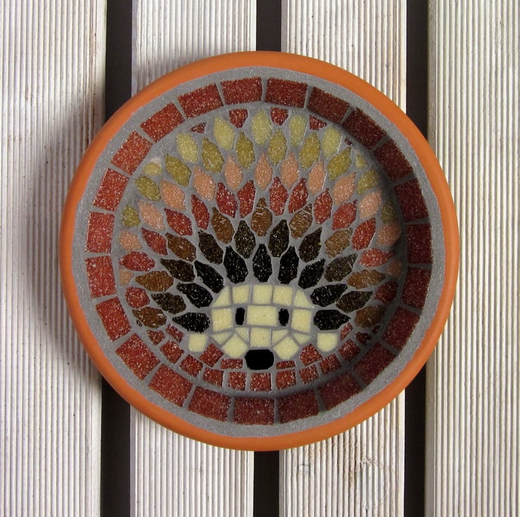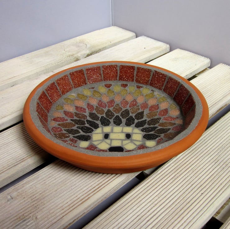 A mosaic hedgehog made using terracotta and shades of browns from cream to dark chocolate. This saucer is perfect for leaving fresh water out for the hedgehogs in your night garden, and it's great to add colour to the garden for you to enjoy, and for birds to drink from in the day too.It would also make a perfect gift for a gardener or nature lover.