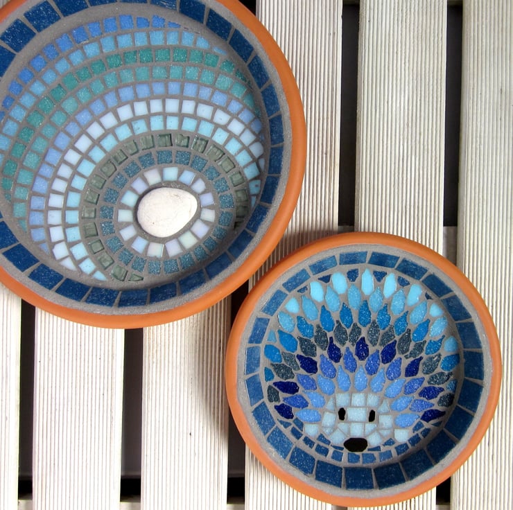 A 19cm diameter terracotta saucer (which can be seen in the blue hedgehog version next to a 25cm bird bath in the item pics) with a mosaic made out of vitreous glass tiles. The mosaic is finished with a grey grout that is designed to repel algae and mold.