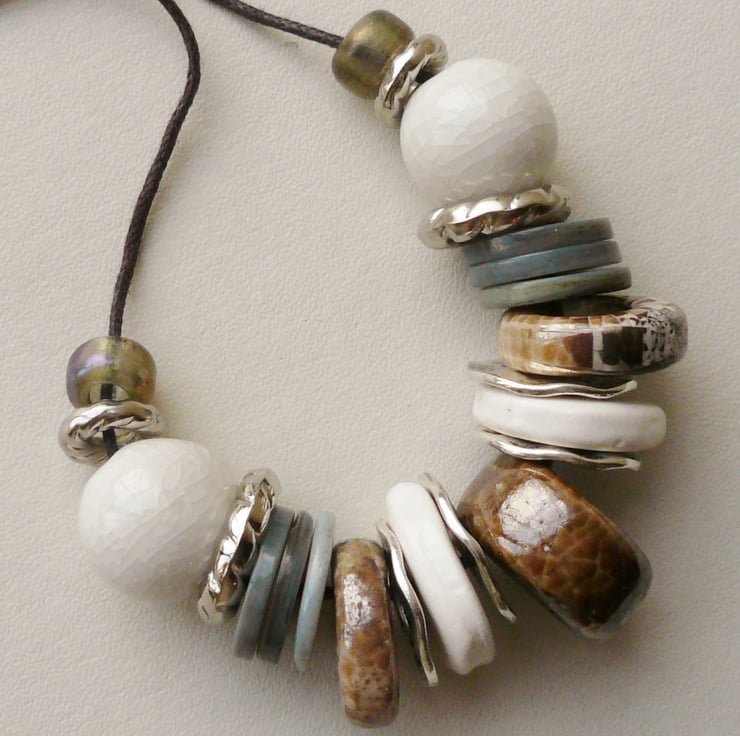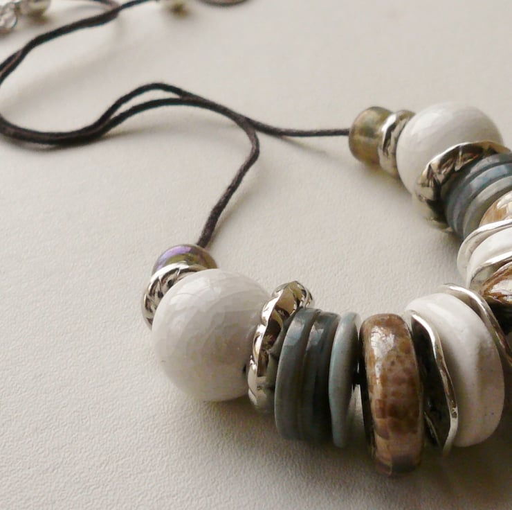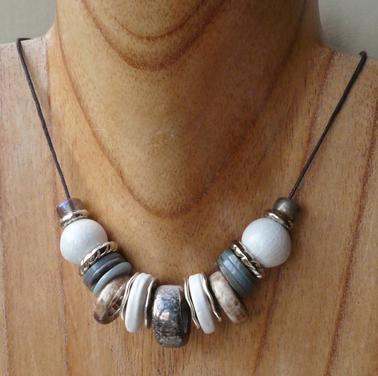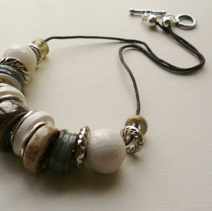 This fairly chunky collar length neutral-tone necklace consists of a central 18mm glazed ceramic rondelle bead in a crackle pattern with co-ordinating earth tone and white coloured ceramic rings, grey shell flat disc beads, white round crackle glazed ceramic beads with smaller grey/brown Toho beads to finish. Tibetan silver and metalised acrylic silver disc and ring spacer beads have been mixed inbetween. These have all been strung onto a 1mm thick brown cotton cord and finished off with a Tibetan silver toggle clasp.