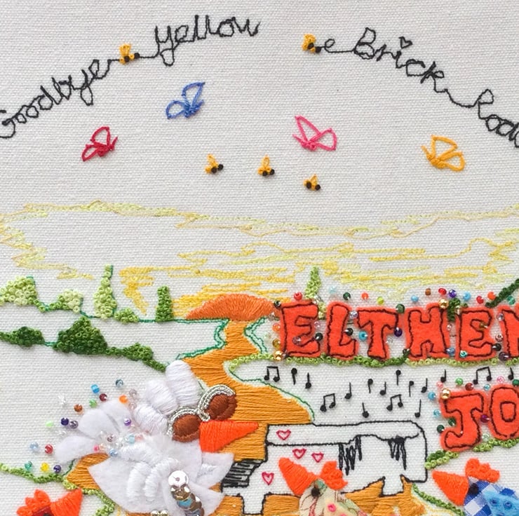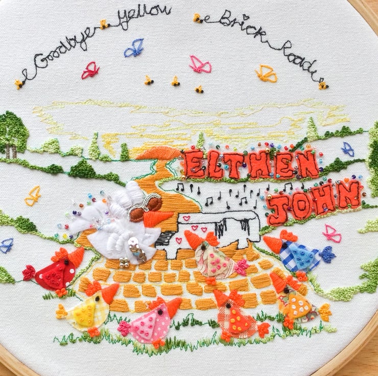 This hoop has been made using a mixture of freemachine and hand embroidery. This design pays homage to my favourite singer Elton John which is why the play on words, and includes my other love fabric chickens. "Goodbye Yellow Brick Road" the album cover has been stitched to show a hand embellished Elthen John, surrounded by adoring dotty, gingham and Liberty print fabric birds. I have used a variety of stitches to pick out the background details, a satin stitch road, french knot trees and free machine embroidery for the lyrics. A special concert for chickens.