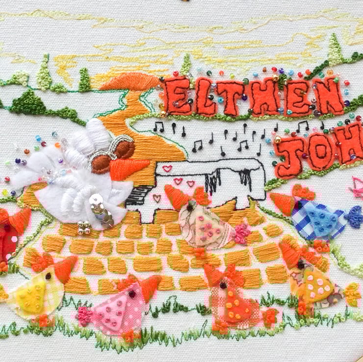 Inspiration came from many hours of listening to Elton John's lyrics, and imagining a world where chickens sneak off to a rock concert, stitched to make you smile.