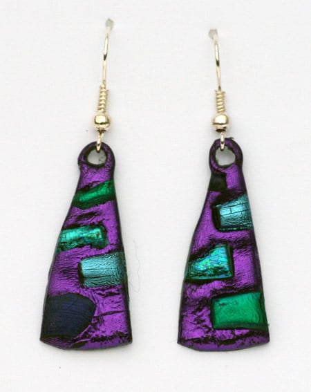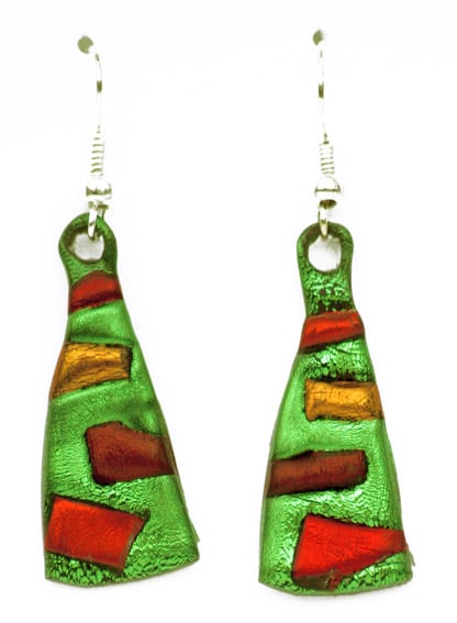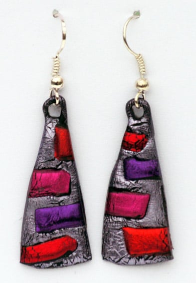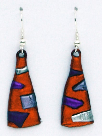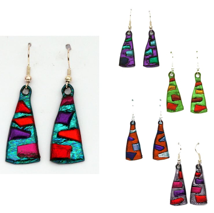 I love to wear bright colours and started making earrings because I couldn’t find any in the colours I liked. This triangle design is popular with those who like to wear dangly earrings but find some of my other designs a little long. I also make many other designs, often also based on natural themes or abstract shapes.