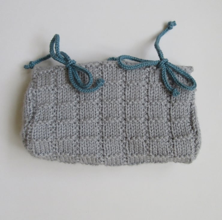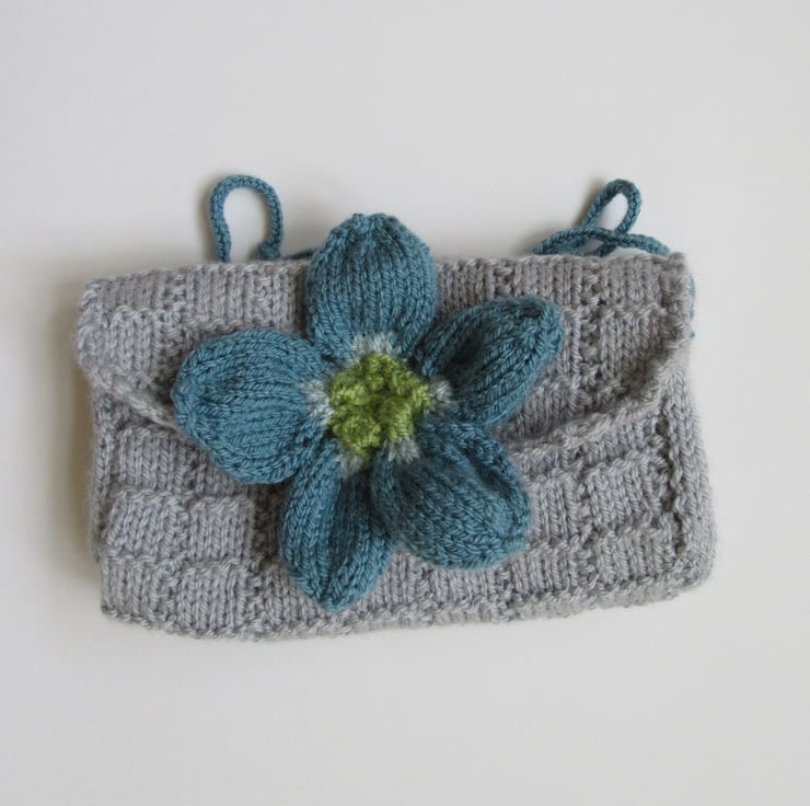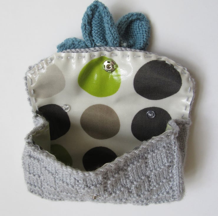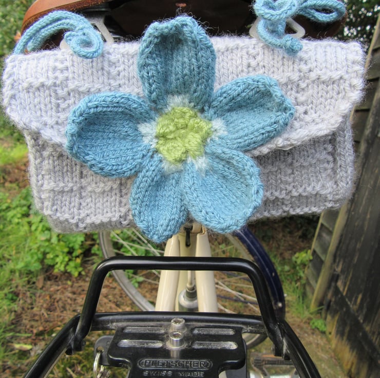 A beautiful ladies silver pewter grey hand knitted saddle tool bag. The bag is knitted in a basket weave stitch, with a knitted lime green and slate blue anemone flower on the front. On the reverse are 2 x 35cm long slate blue cord ties, which are reinforced with clear buttons on the inside.The inside is lined in a large, lime green and dark grey spotty PVC fabric, giving a water repellent layer.The saddle bag is closed using a strong popper, also reinforced with a clear button on the inside.