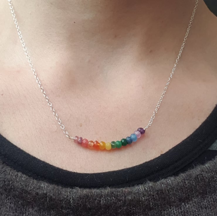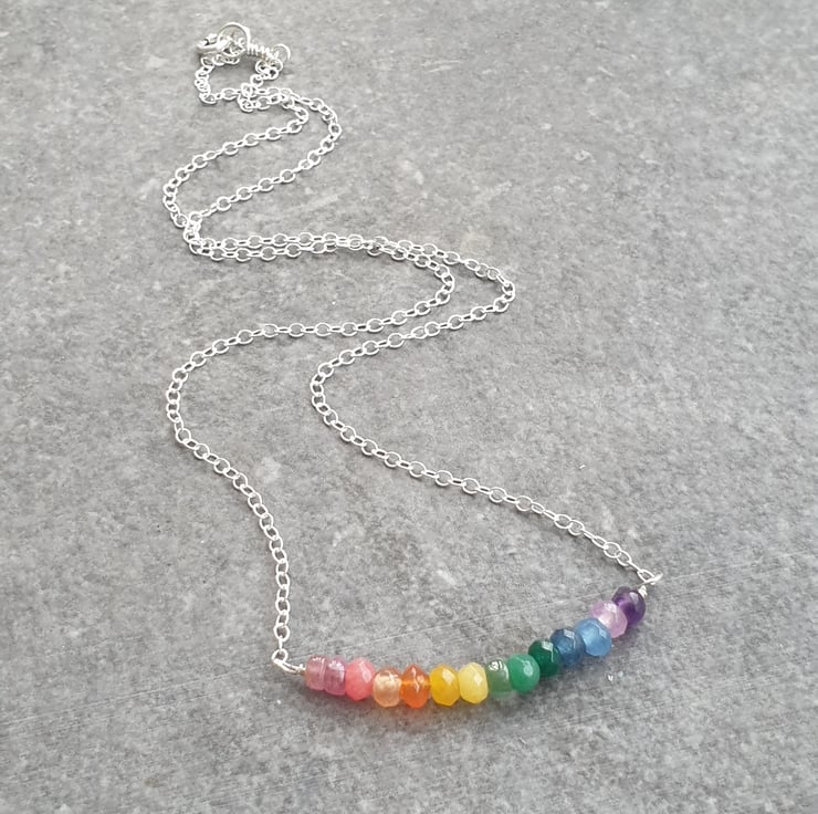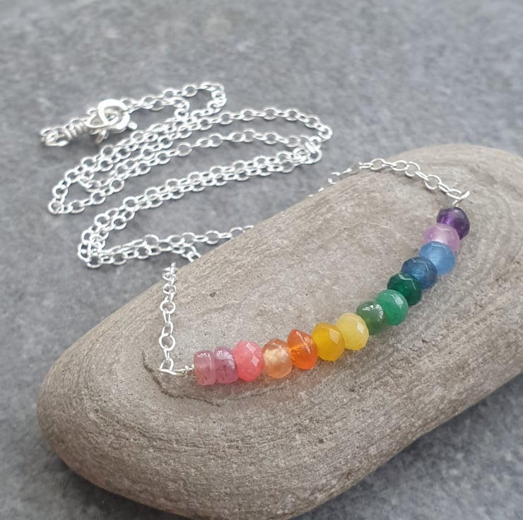 It is made in the popular bar pendant style, and features a row of tiny faceted rainbow tourmaline gemstone beads along with some faceted agate, on a sterling silver wire, finished off either side with sterling silver chain and a bolt ring clasp.