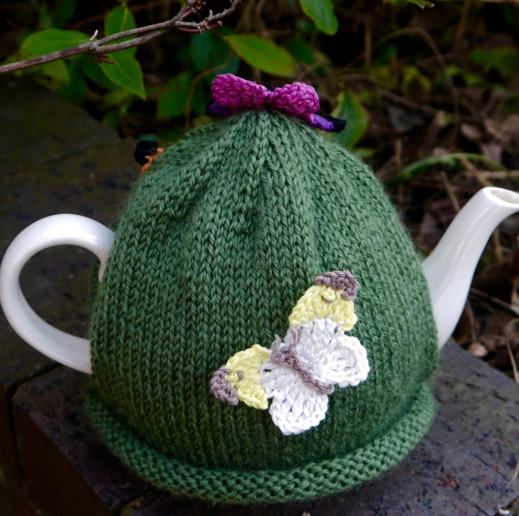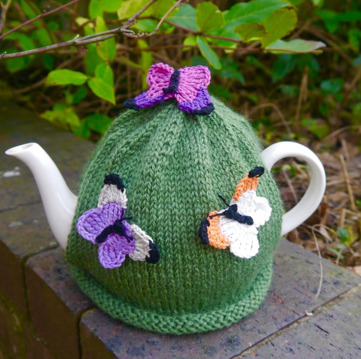 If you love butterflies then this is for you. A hand knitted green tea cosy with four crocheted butterflies attached. The tea cosy is made with lovely warm aran wool and the butterflies are made using 100% cotton yarn. Each butterfly measures approx 4cm x 6cm. The cosy will fit a standard 4-6 cup teapot.