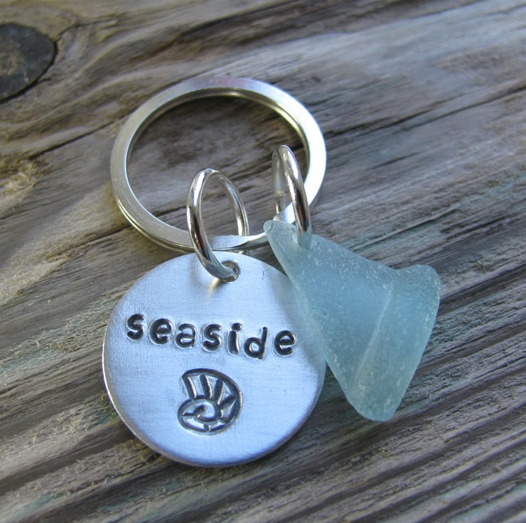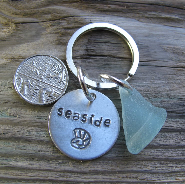 The disc is cut from aluminium sheet then stamped with the words 'sea side' and a shell . I have added a nice chunk of sea glass onto the silver tone keyring, this would make a lovely gift!