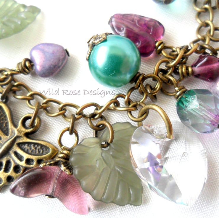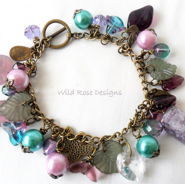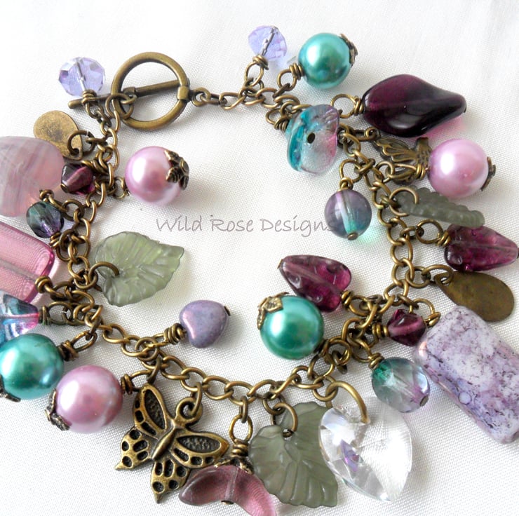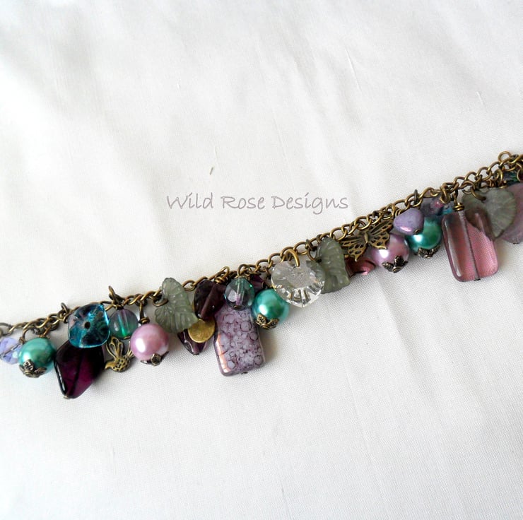 This lovely handmade charm bracelet has a real vintage feel to it with colours that remind me of foxgloves nestling in the borders of the garden.