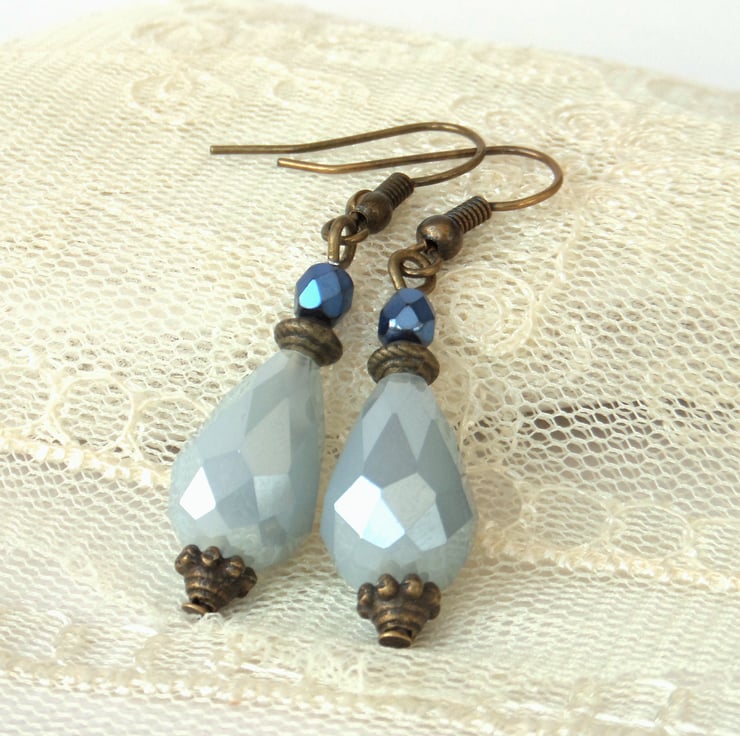 Pale blue crystal droplets combine with smaller rich blue crystals and hang from bronze wires in these pretty earrings.