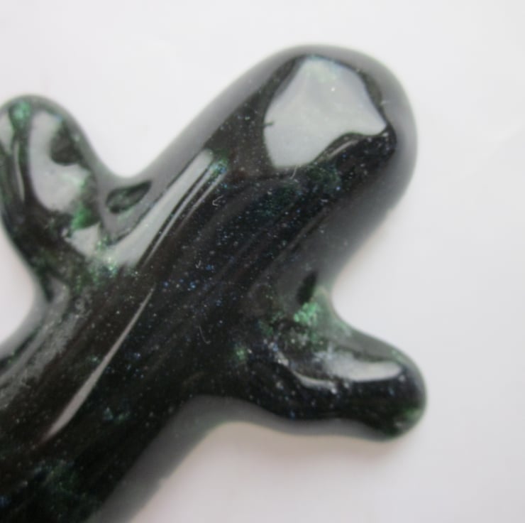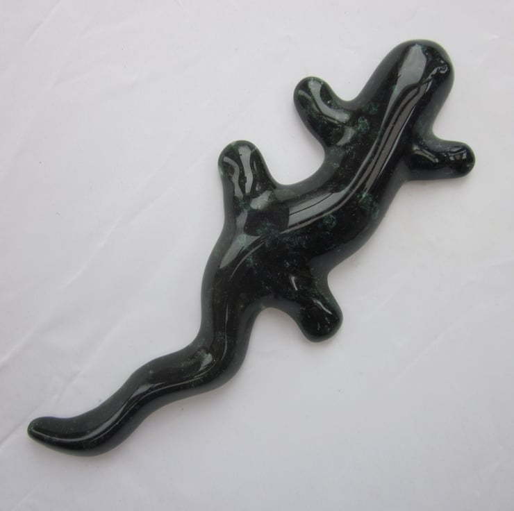 It is a stunning lizard or salamander, with a body in dark green aventurine glass with a hint of blue aventurine running down his back. Aventurine is a sparkling rock known for it's subtle shimmer and my photos can't do justice to it. The glass is very tactile and would make a great ornament.It is 12-13cm long.
