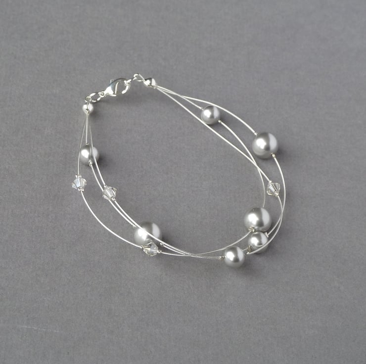 This silver floating pearl jewellery set has been created using sparkling crystals and lustrous glass pearls and would make a perfect gift for bridesmaids in a soft grey themed wedding.