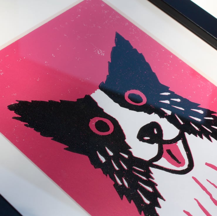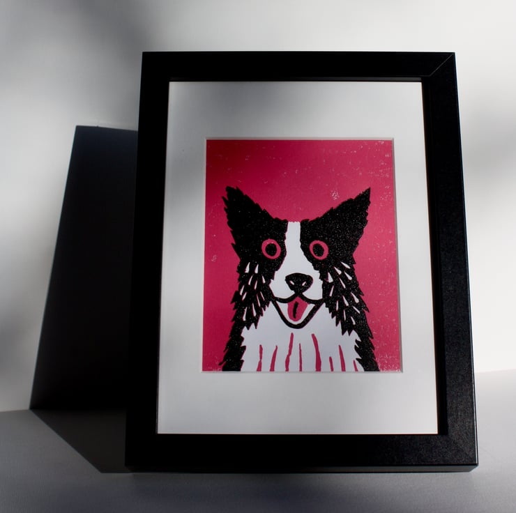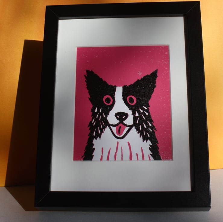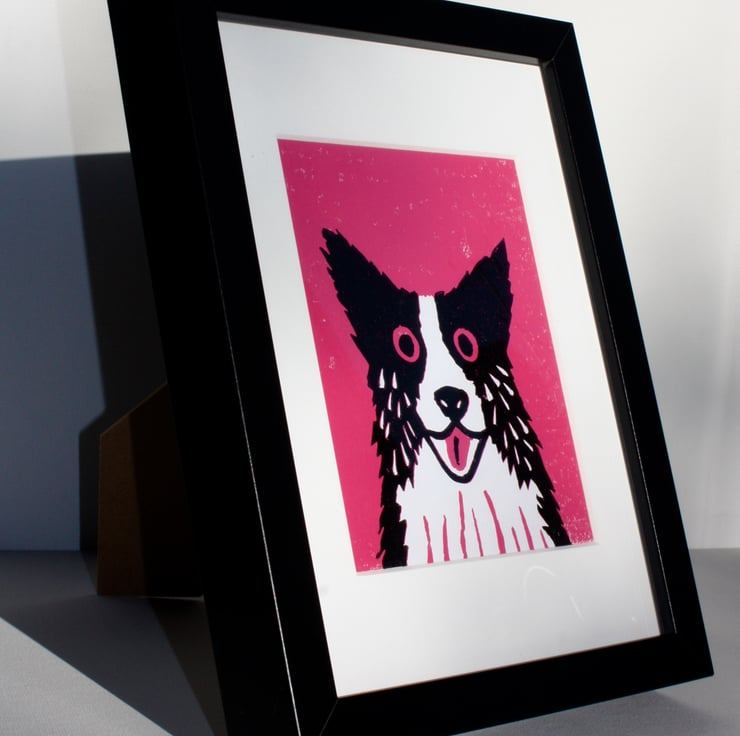 This is the latest in my series of cats and dogs linoprints with beautiful bright backgrounds. This reduction linocut made in my home studio is available with a pink or blue background (see other listing) and comes finished with a museum quality white mount and framed behind glass in a black frame. The complete picture can free-stand or be wall hung. It measures 20 x 26.5 cm in total.