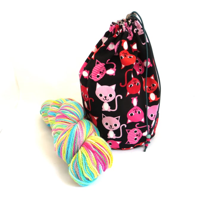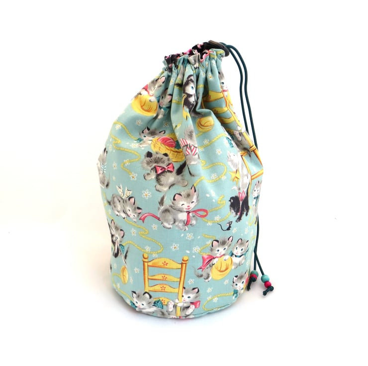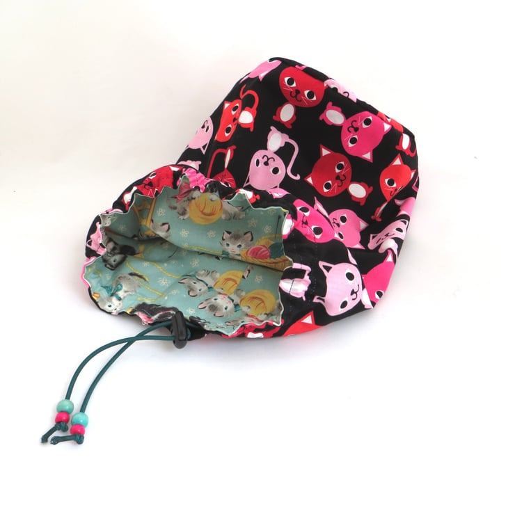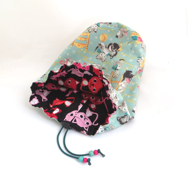 I made this cotton drawstring bag from a pretty print fabric featuring playful kittens on a pale mint background and lined it with a bold pink on black cat print fabric - or perhaps the other way around as the bag can be used with either fabric facing out. The circular base is approximately 15cm in diameter and the bag stands 25cm tall (approximately 6” by 10”). The drawstring is elastic cord decorated with wooden beads and fastened with a toggle to keep your items safely inside.