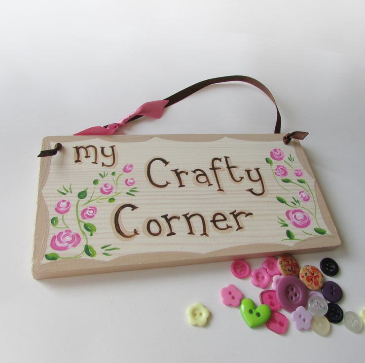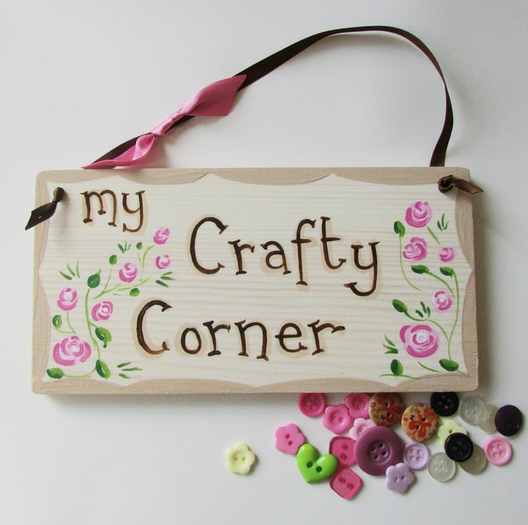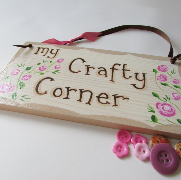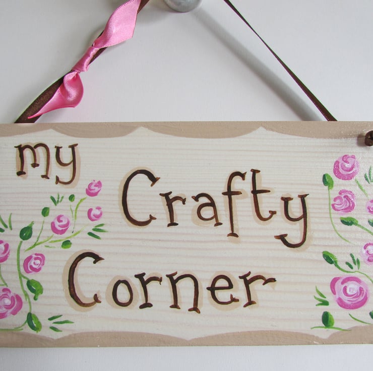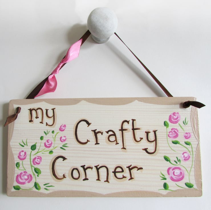 My Crafty Corner Plaque, hand written and hand painted using acrylic paints and finished off with an interior varnish and a bit of sparkle.