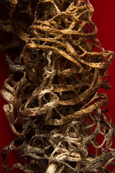 A hand knitted scarf in a decorative lacy effect light wool. This is a beautifully soft scarf suitable for any occasion, indoors or out. The scarf measures over 1.5 meters in length and between 15 to 20cm in width. It is a lovely combination of bronze, beige and brown colours.