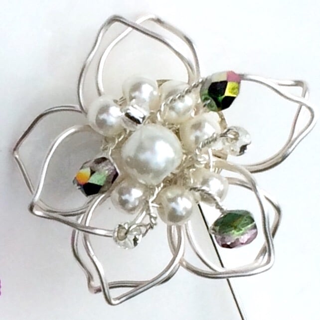 I have formed silver plated wire into a double flower shape and added glass pearl beads to the centre of the flower. Silver lined seed beads and irredecent Czech crystals have been twisted on fine wire to make the stamens. The flower is attached to a silver coloured pin with safety cap to cover the point.