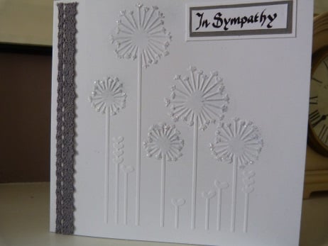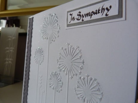 A completely handmade and uniquely designed card. Consisting of pristine white quality card which has had a design of dandelions embossed. The dandelion heads have been decorated with fine glitter. Finished off with In Sympathy handwritten in black ink in gothic style and a grey cotton lace ribbon