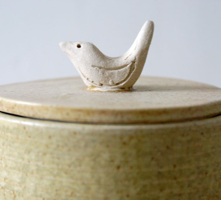 A satin brown glaze decorates the inside and outside of this piece with it's creamy tones. A shallow flush fitting lid with sits on top of the canister which also features a hand sculpted little wren.