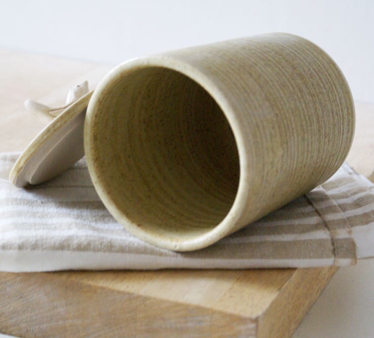 I created this pottery canister from durable white stoneware clay with a simple modern style. Its distinctive tall shape has the ideal size for storing coffee, tea, or sugar by your kitchen kettle.