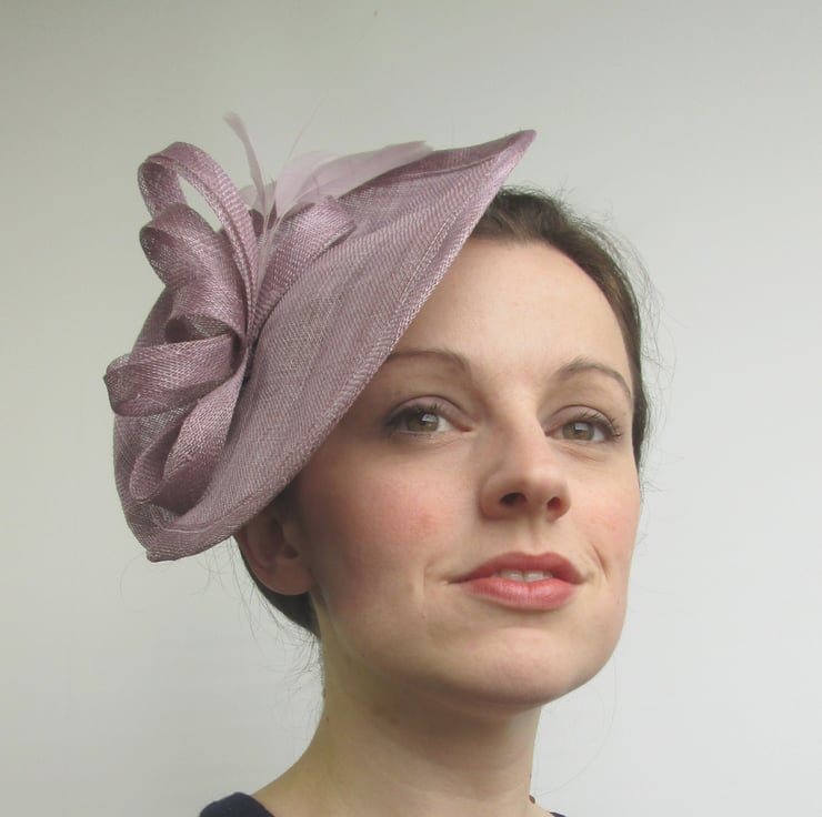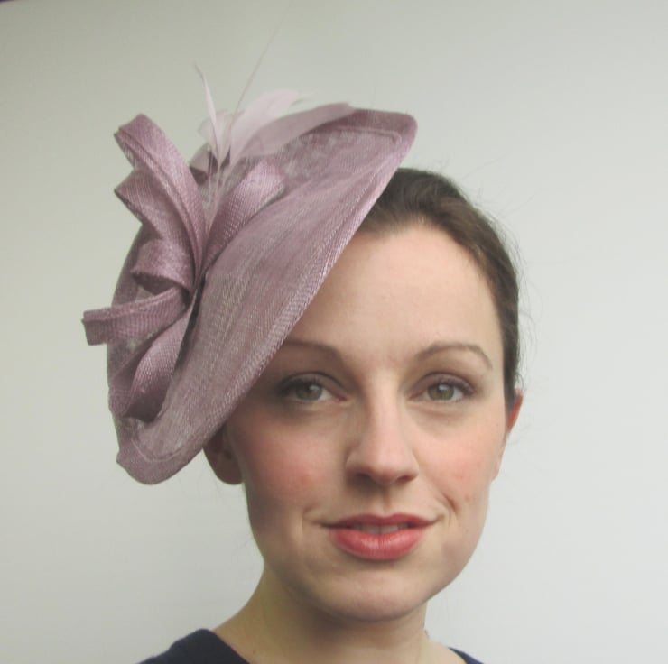 Ladies fascinator handmade in lilac sinamay fabric. Ideal for races, weddings, summer garden parties, christenings and formal occasions, this elegant saucer style hat gives a very feminine elegance perched over one side of the head.