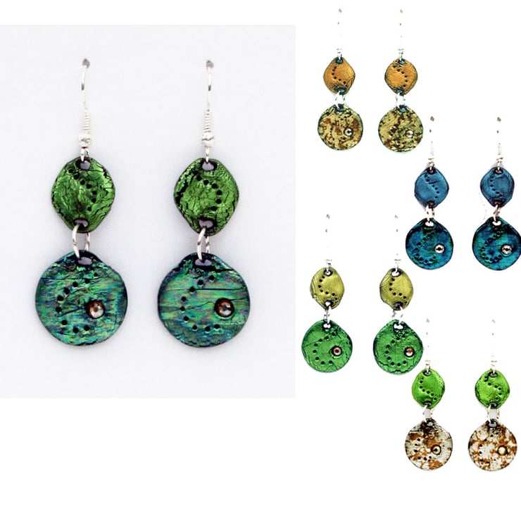 I love to wear bright colours and started making earrings because I couldn’t find any in the colours I liked. This design of medium & small circles is one of my favourites as I love to play with the colour combinations. You'll find reds and purples in this design as a separate listing. I also make many other designs, often also based on natural themes or abstract shapes.